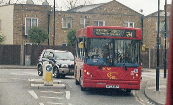 Slimline DCS1-9Hackney had been operating the backstreets 394 (Islington - Cambridge Heath) since September 2001 using a pair of odd Renaults with Rohill bodywork. They retained the contract in 2002, with a service increase requiring more buses. Ordinary Dart SLFs were too wide for the route, but Caetano came up with a slim (2.3m, ie 7ft 8in) narrow version of the Nimbus which would fit here (and in Jersey too). Nine, to become DCS1-9, arrived in April 2003 for the extended route (Homerton Hospital - Islington).DCS2 and 4 negotiate the back-streets of Hackney on the 394, April 2006DCS6 near Ash Grove garage on the 394, April 2014, now all-red.