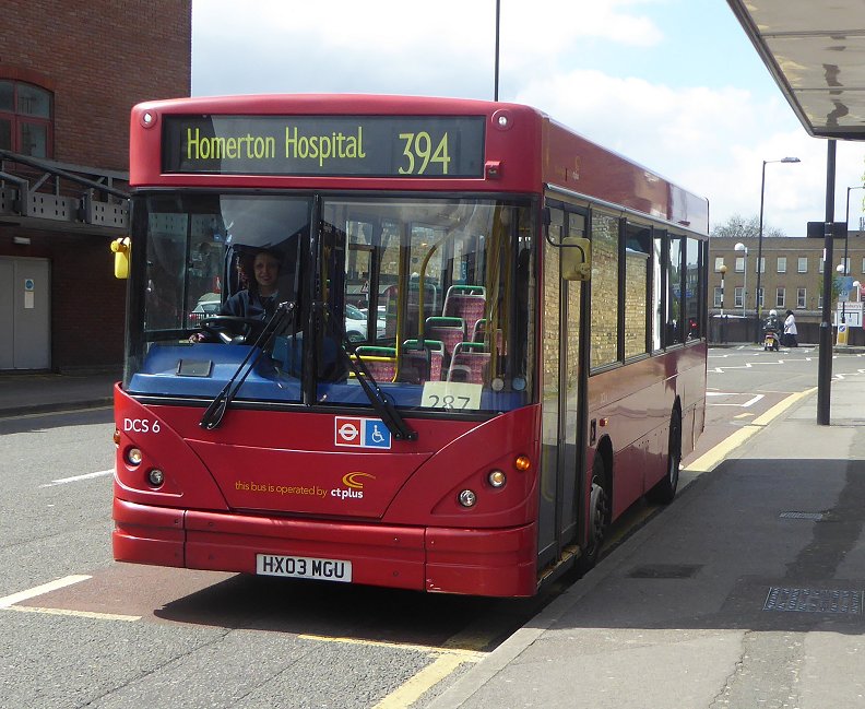 DCS6 at work on the 394, Islington, 27th April 2016.Short-term PointerIn October 2003 an ex-Connex 10.7m Pointer (ex DPL14) was acquired for use on the 153.Ex-Limebourne Caetano Compasses: HDC12-14In December 2005 CTPlus, as the company was now known, took on three Compasses that had originated with Limebourne (Independent Way) in 1999, that had subsequently worked for Connex after the takeover. East Thames Buses had then used them on the 42. CTPlus initially used HDC13on the 153, and later on the W13. HDC12 and HDC14 became dedicated trainers. HDC12 was sold, and HDC14, now renumbered as HDC12, was refurbished for use as a bus on the 153 and W13.Ex-Mitcham Belle Caetano Nimbuses: HDC14-18In spring 2007 CTPlus won the contract for the W13 (Leytonstone - Woodford Wells, which required new Darts plus a double-decker for peak workings. New Darts by now were EnviroDarts, but these were decidedly popular at the time, and not available in time. So CTPlus took on five more Nimbuses, leased for four months from Dawson Rentals. These were ex-Mitcham Belle and Centra, after the collapse of the latter's Central Area operations. A couple had also been spot-hired by Docklands buses for use on the W19. Anyway, HDC14-18 worked the W13 between April and July 2007, still in red with blue skirts.