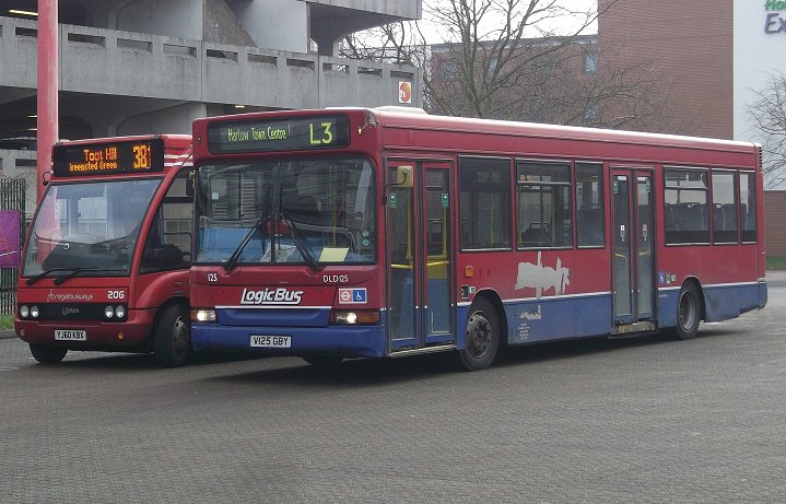 Two more ex-Metroline DLDs followed later in 2012, DLD139 and 149, both dual doorway in red/blue. The L3 route was tinkered with, with an extension to Cuffley and short-workings to Cheshunt. The ex-Armchair buses: DP1001, 1003, 1007.In December 2012 Logic Bus competed with Roadrunner on route 1, and acquired three dual-doorway buses from Ensign Bus to run it. These were DP1001/3/7, that were ex-Metroline, having started with Armchair at Brentford. They were put into service in plain red livery, with white roofs. They were equipped with digital destination displays.DP1003 on the 1 at Harlow Bus Station, alongside DLD125 February 2013.