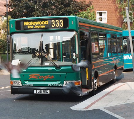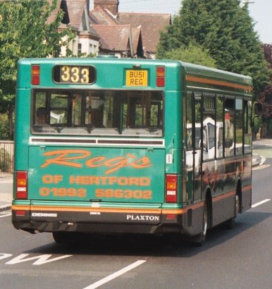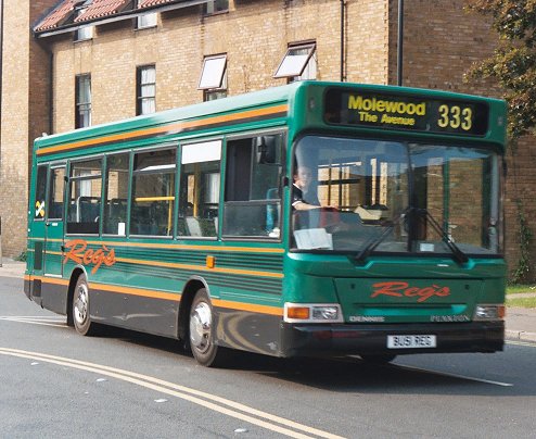 Reg's Dennis Dart SLFReg of Hertford was a small independent company, that for several years had tendered to Hertfordshire to operate the 333, a local Hertford service between the town and Bengeo - an estate up the hill. Reg had used a couple of Dennis Darts on it at different times - it was a one-bus route. In 2002 a new Dart MPD was acquired for the route, to meet the low-floor requirement, with a Dart/Wright as a back-up. The MPD was in perhaps the smartest livery of any in the wider London area, in metallic green and bronze. It had a personalised number-plate too: BU51 REG.REG at Hertford Bus Station on its regular 333 between Bengeo and Molewood, 1st June 2003.The 333 was lost to Golden Boy in March 2006, and the MPD was redundant apart from hire work. It was sold to Excel at Stansted Airport in July 2006, where it quickly assumed the bland area livery of white with a blue skirt.