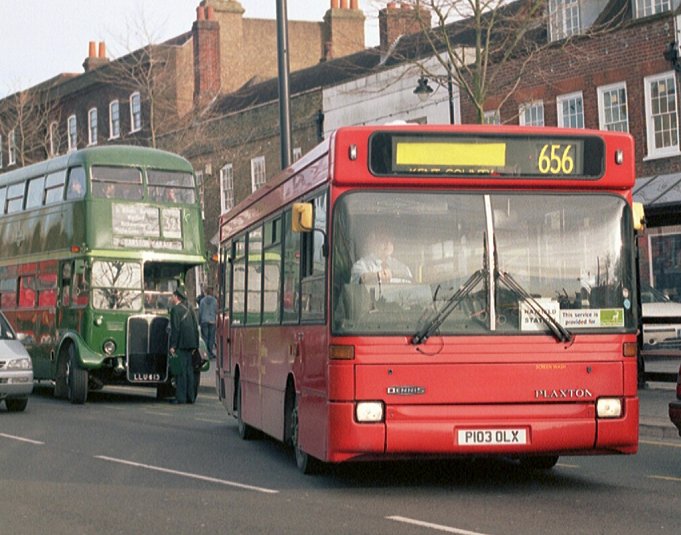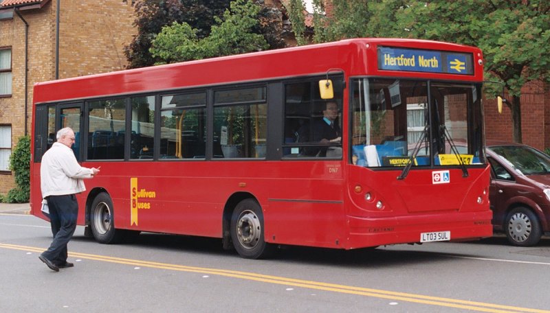 Pointers: LDP10,17,29,31,33, DLS103In April 2004 Sullivan Buses bought the first two of five London General Pointers. LDP29 and LDP31, acquired via Ensign Bus, were early 10.0m "shoebox" Pointers seating 36, with only a single doorway. They were put to work on the 950 Express service between Staines Station and Thorpe Park, but were soon found on other Sullivan services as well.In February 2005 LDP29 had a spell in Kent, working on the Tunbridge Wells services taken over with Southlands Travel. March 2005 saw the arrival of two more LDPs: LDP10 and 17 were the short 9.2m thirty-two seaters. In May, when Sullivan took over the Borehamwood local serevices B1, B2 and B3 from Arriva, the four LDPs became their normal vehicles. LDP33, another longer SLF, was added then too. LDP 31 at Hatfield Station, May 2007. DLS103 in St.Albans in January 2007 on 656 to Borehamwood.A very similar short Pointer was acquired in August 2005: DLS103 was a 9.2m bus from Metroline. The "shoebox" Pointers were sold off in 2009-2010, replaced by much younger EnviroDarts. Ex-London United Pointers: DPS 574-7