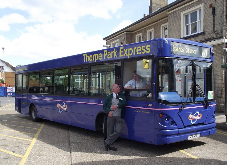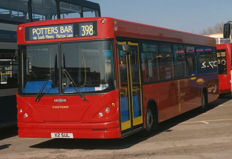 DN1 on the 950 to Thorpe Park, at Staines Station, May 22nd, 2011.DN2 followed in April 2002. This was another longish Nimbus, at 10.5m, with another personalised registration mark: DN02 SUL. In February 2005 it had a spell in Kent, working on the Tunbridge Wells services taken over with Southlands Travel. It was back in Kent in May 2009, on loan to Nu-Venture.DN2 was substituting for a train on the Hertford Loop in June 2002, near Cuffley. In January 2008 it was on the 656 to Borehamwood, in St.Albans.