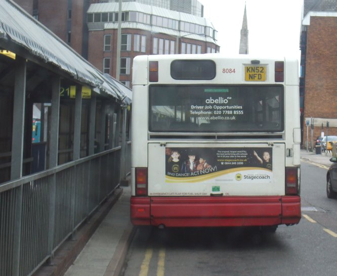 325-335: MPDs for ByfleetThese eleven 8.8m MPDs were for Byfleet's country routes, so came dressed in T-GM's traditional white with blue skirt and yellow band. They arrived when expected, in January 2003, and replaced the thirteen hired ex-Armchair buses.Renumbering made them DP75-85 in 2006, and 8075-8085 the following year. They received Travel Surrey red and white livery in 2007-9. They were released from duty by Abellio Surrey in the winter of 2010-11, and were returned to their lessor. 8084, previously 334, at Guildford Bus Station on the 515, September 2010