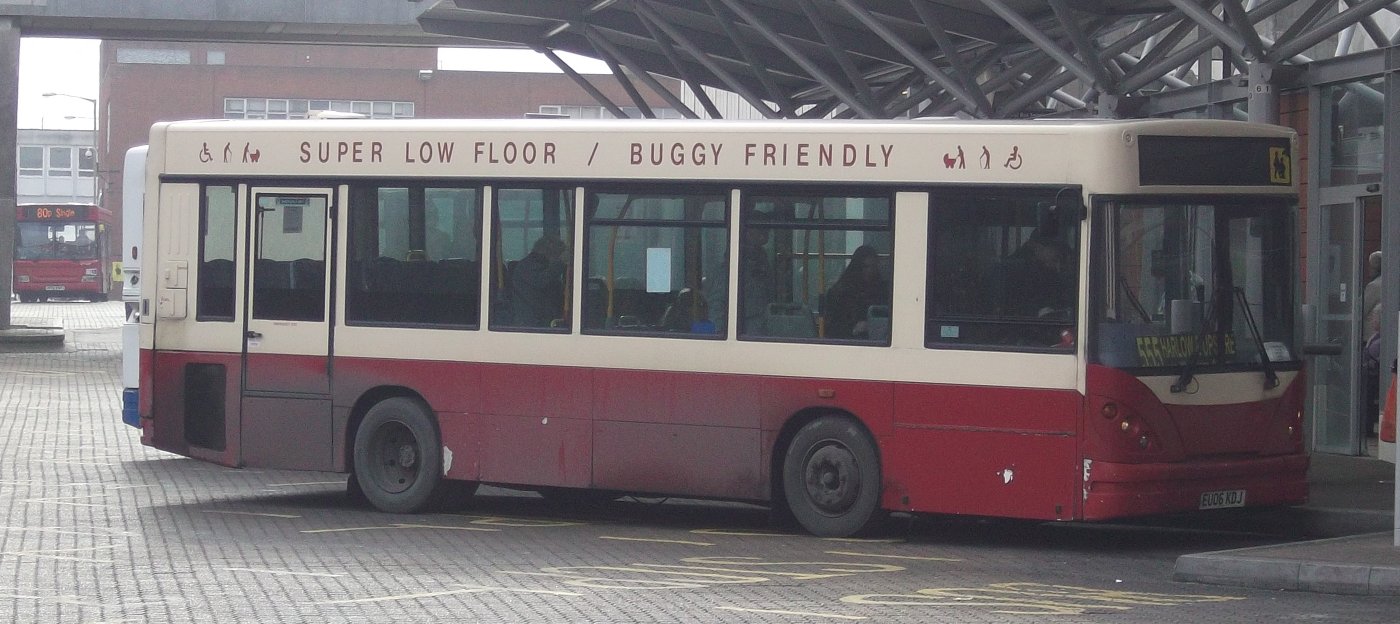 Move to Waltham AbbeyThe base for Travel with Hunny operations moved from Collier Row to Waltham Abbey in spring 2010, much reducing dead mileage for the company's Harlow operation. Route 392 was lost to Roadrunner in September, but the main 555 route was kept by TWH, registered to Gemma Smith Ltd (owner of the Waltham Base). Buses for the 555, in particular the UVG Dart SLF, plus a step-entrance Dart (P103HNH) were given the all-red treatment, with vinyl front destination "blinds".More Dart SLFs for the 555/255/355/X5. Lea Valley Buses hives off and founders.In January 2011 the 555 was split into two sections: 255 (Loughton / Debden - Harlow) and 355 (Harlow - Waltham Cross), under the Gemma Smith licence. From February Hunn started the X5 (Harlow - Romford).For these changes the two licencees gathered more buses. A pair of 10.0m SLFs with Alexander bodies that had originated with Armchair came from S.M.Coaches, with the blue skirts overpainted to red. The Mecca Bingo livery swapped from the UVG to one of the MPDs, the UVG gaining its overall blue with gold band and branding for the X5. One of the new acquisitions had a very short career with TWH, suffering a disastrous rear-end fire at the end of January, which wrote it off. In mid-February Gemma Smith and Hunn formally parted company. Gemma Smith kept the 555 and 255, with the remaining ex-Roadrunner Dart SLF, and the Waltham Abbey base. This operation took the trading name of Lea Valley Buses. Two more of the ex-Armchair SLFs came from Roadrunner to Gemma Smith (LVB) in February plus three very similar ex-London Central LDPs: 77,79 and 162. These SLFs were soon sold back to Roadrunner, replaced by Volvo B6LEs, but the company did not prosper, selling out to Roadrunner in July 2011.