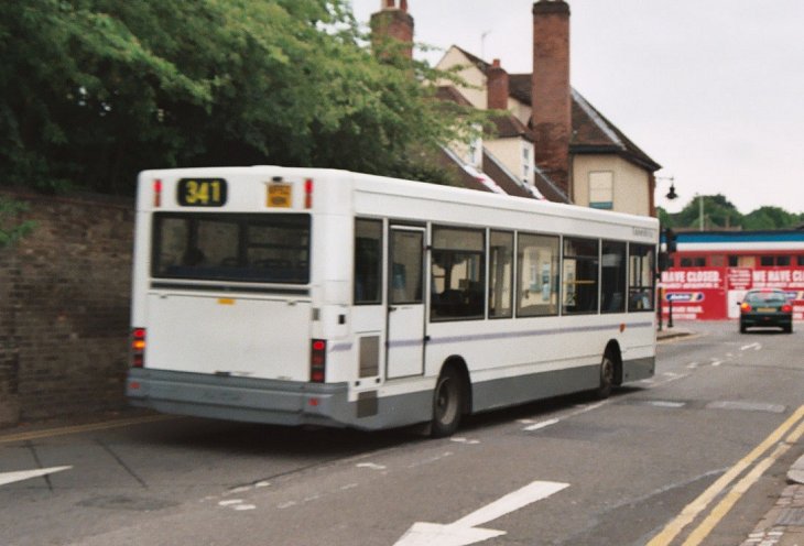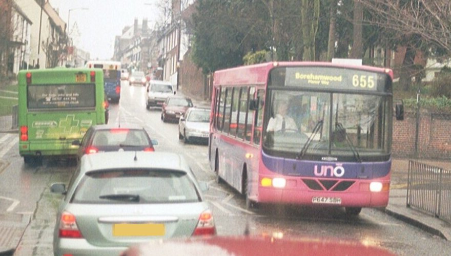 Another batch followed later in the year, starting in September 1997 and completing in January 1998. This comprised R647-654VMJ. These eight were then complemented by YDZ2082, another Wright's demonstrator. They provided low-floor buses on the 600, 601, 602, the 657 and the 330, 340, working alongside the two Mercedes-Benz OH1416s with Wright UrbanRanger bodies. 648 and 652,3,4 were the first to be treated to the new pink and purple livery in September 2004. At first they had no fleetnames, carrying Universitybus boards inside the windows, until the new fleetname of uno was adopted. The rest followed into new livery/names over the following months. Some gained cant-rail route branding for the 603, 634 and 636. January 2007: 664 sweeps into St.Albans City Station on the 655 to Borehamwood; 665 crawls along the busy St.Peters Street in St.Albans with a 602 to Watford.647 whooshes down Holywell Hill on the 655 on a wet Saturday in January 2006; In rather better weather 649 nears the Queen Elizabeth Hospital in Welwyn Garden City on a 603, in September 2009. It seems to have lost part of the distinctive Wright W on the front.Disposals started in mid-2009. 648 was partially burned out in April, and was sent north to Ripley's. 647, 649 and 653-655 were sold to Ripley's in the autumn, with 647 and 653-655 moving on for further service with Tate's of Darton, South Yorkshire.Medium Plaxtons for the 341In August 2002 Universitybus bought a pair of 10.1m Pointer2s for use on the 341 (Ware - Hertford - Hatfield Station) and 641. They were registered in September. They were painted white, with a grey skirt, discrete Universitybus fleetnames and a waistline decoration. With the company's normal attention to detail, they were seldom found anywhere else.The two were repainted pink/mauve in July 2005, and were numbered 101 and 100. They lasted until the 2016 clear-out, when these two were sold to Redline Buses of Aylesbury. KF52NBN leaves Hertford Bus Station on the 341, June 2004.