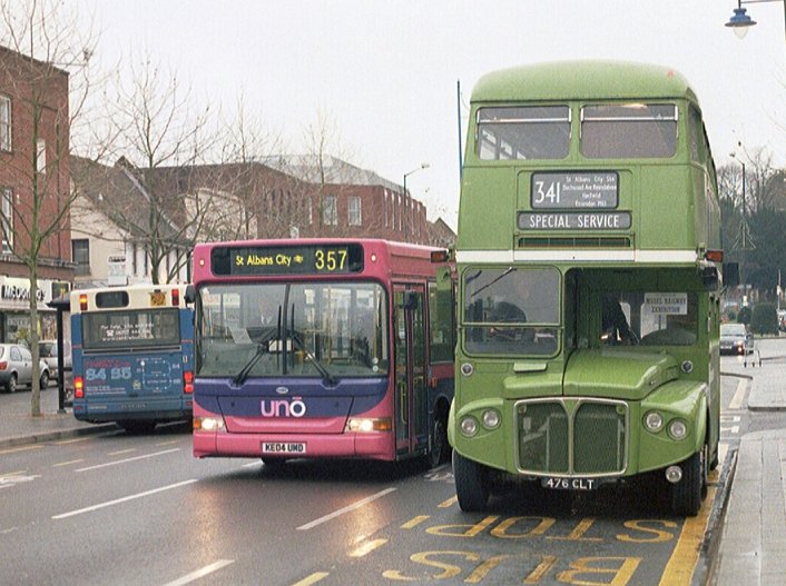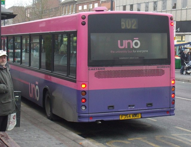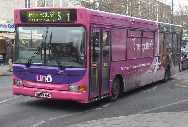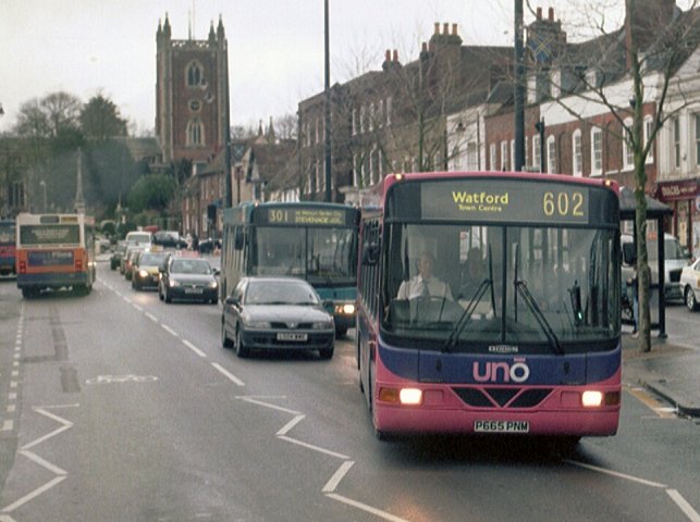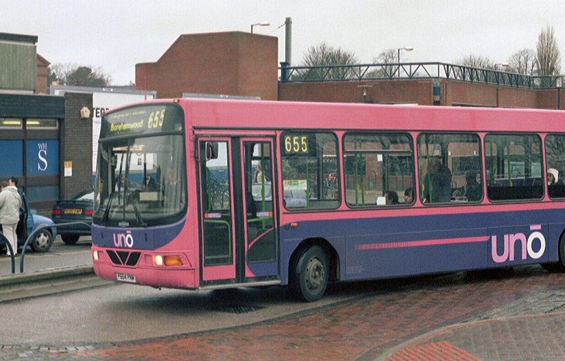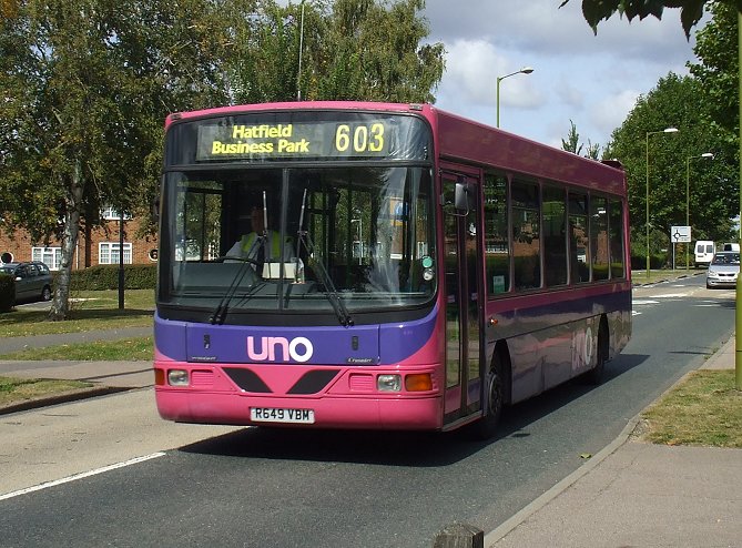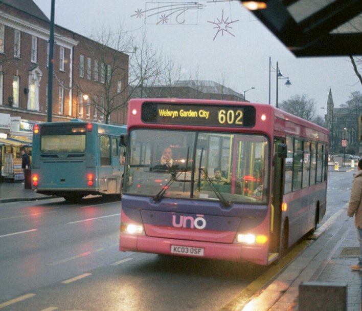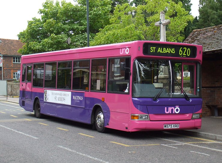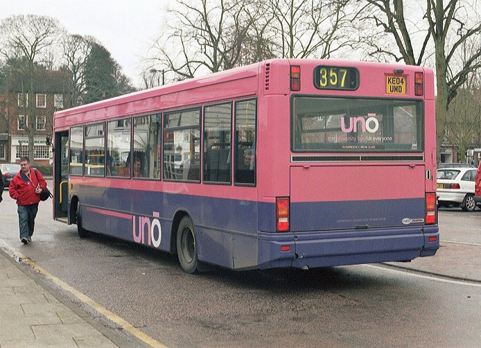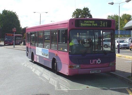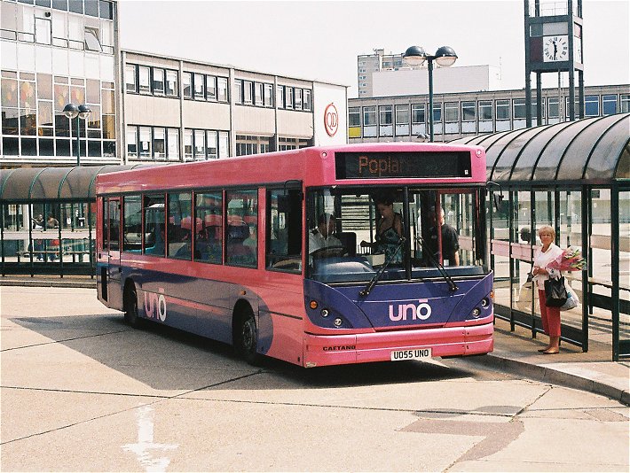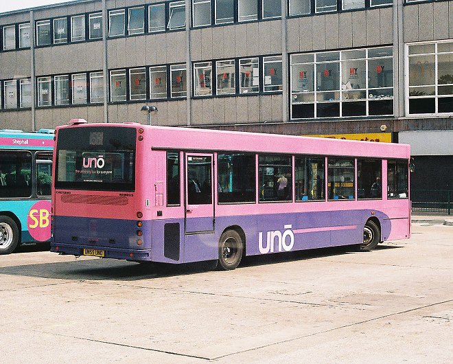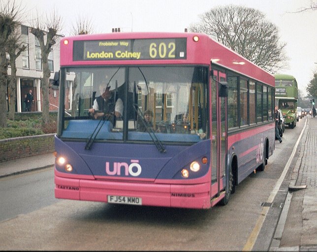 Caetano NimbusA narrow-bodied Caetano Nimbus demonstrator, HX53ODH, was on loan in December 2003, but it was two of the full width, 10.88m long version that arrived in September 2004. These wore the new pink/mauve livery, but had to wait a while for the new uno fleetnames. They received numbers 151 and 152.153 and 154 arrived a year later, in September 2005, with two more seats (B38F rather than B36F), digital displays and complete with new fleetnames. They worked the 634/635 north to Stevenage (Lister Hospital) and also the SB1. Sunday 602 in St.Albans in January 2006: 151 and 152.Stevenage Bus Station in June 2007: 154 and 153. Note the difficult to read digital displays: these buses are operating Stevenage service SB1 to Poplars.The St.Albans Darts: Uno Buses LtdOn 4th March 2008 the St.Albans operations of Centrebus were taken over, with a new company called Uno Buses Ltd holding the licence. The routes and buses were acquired. This included all but one of the ex-Sovereign 10.7m Pointer2s, the two ex-Sovereign MPDs, and two Centrebus MPDs. The fourteen 10.7m buses became 563-565, 567-569, 571-578 (566, at Stevenage, being the one retained by Centrebus). The ex-Sovereign MPDs had been 582 and 583, and now became 104 and 105. The two Centrebus MPDs, which had been 584 and 585, and then 352 and 353, became Uno 103 and 102. The acquired buses wore a medley of liveries: some still wore a modified version of Sovereign white and cream, some had been repainted to Centrebus orange, white and blue, while others sported a range of Super-side or overall adverts. Uno kept the fleet where it was, but promptly set about removing the old liveries in favour of pink and mauve, although it mostly kept the large advertisements in situ for the duration of the contracts.January 2009 in St.Albans: ex-Sovereign 10.7m uno567 and ex-Centrebus 8.8m uno102 stand in St.Peters Street (with RF308).