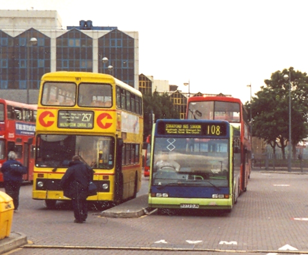 181-182: new for Ensign CitybusTwo single doorway Dominators were bought in a hurry for the Walthamstow takeover, and arrived in October 1991 ready in the new yellow livery for routes 97A and 215 (along with new Olympians). Unfortunately the changeover publicity leaflets told the public to expect new blue and silver buses, so there had to be a temporary swap to provide the "correct" colour buses for a transition period.The two buses operated as part of the single-doorway bus pool. They differed from the first batch in more than doorways: 181 had a Gardner LG1200 engine, 182 a Cummins. They spent time at Hackney from October 1996, working on the D6 (Hackney Central - Crossharbour) and 257 (Stratford - Walthamstow Central) routes. They followed their two-door cousins north to First Glasgow in the winter of 2002-3. 181 was in Stratford Bus Station on Thursday 3rd August 2000, as one of a very mixed bag working the 257.191-198: ex-Southampton Citybus