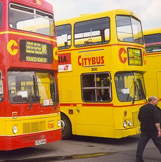 202-203: ex-London CoachesThese two had started off as London Buses' Dominator evaluation buses H2 and H3 in 1984. They had moved on to London Coaches for contract and sightseeing work, with single doorways, in 1991, and acquired London Plus livery. Capital Citybus bought them in August 1993, put them into yellow livery and reinstated the blind displays.At various times they worked from Northumberland Park, Dagenham or Hackney as required. 202 partially lost its roof to the railway bridge at Cranham in November 1996, but was repaired and reinstated. The duo were transferred north to First Leicester in November 1999.