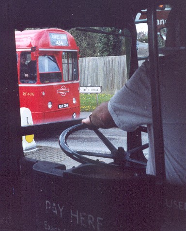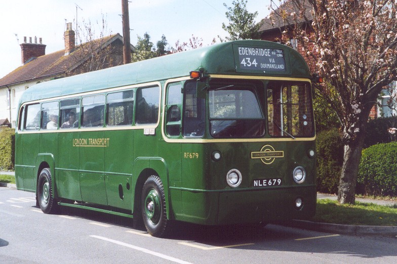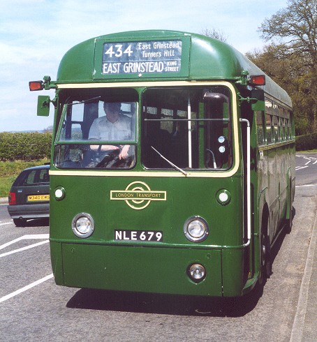 We wound through the town to East Grinstead Station, then whirled round the one-way system onto the road out to Kingscote. On the way we passed RF406, coming back on a 434 service. I was disappointed that the bluebells are late this year, so the woods along the route to Kingscote were not dusted blue as they were on the 1998 Running Day. We pulled in to Kingscote Station, where we found RF672 waiting for its turn on the 434 (presumably the one after ours: why did we always have negative turn-round times?) RP90 was waiting with a bus-load of Bluebell Railway passengers to take to East Grinstead station. 434: Kingscote Station to Edenbridge via Troy Town