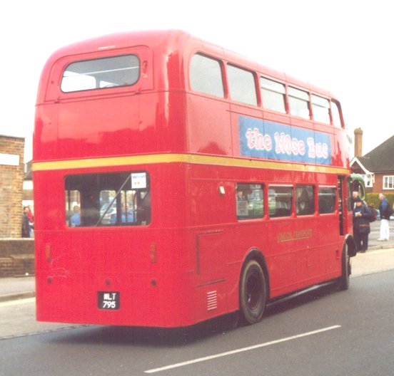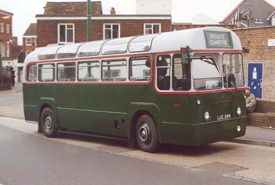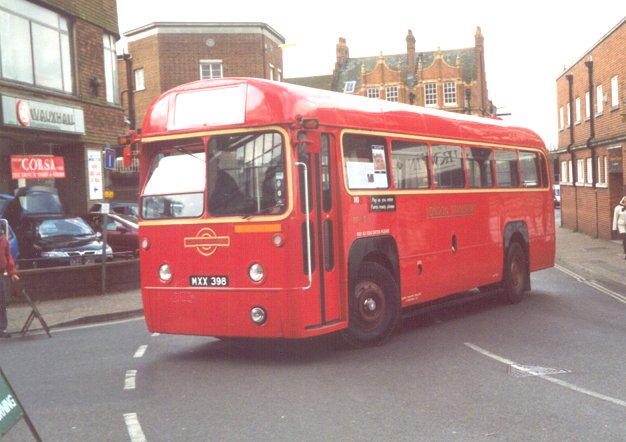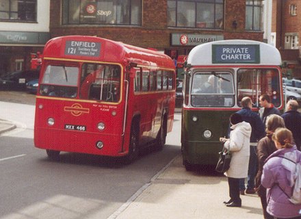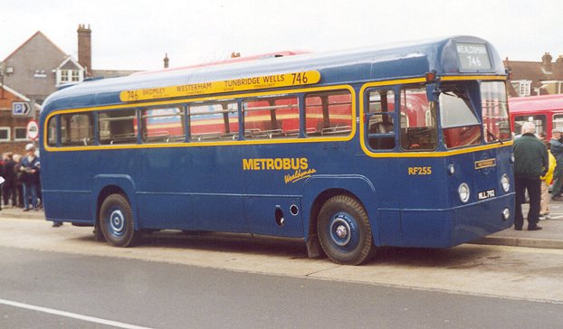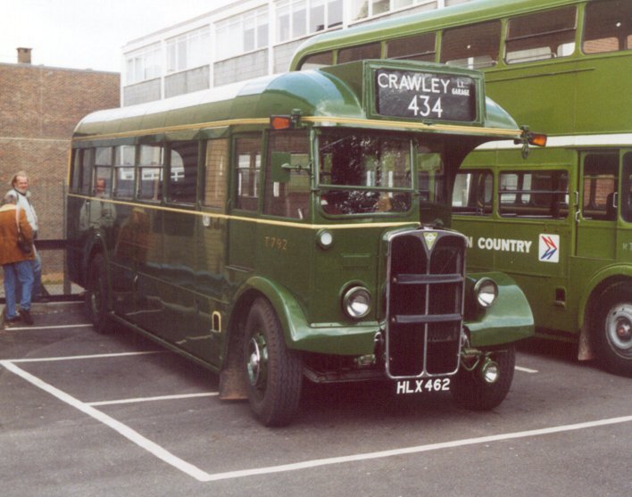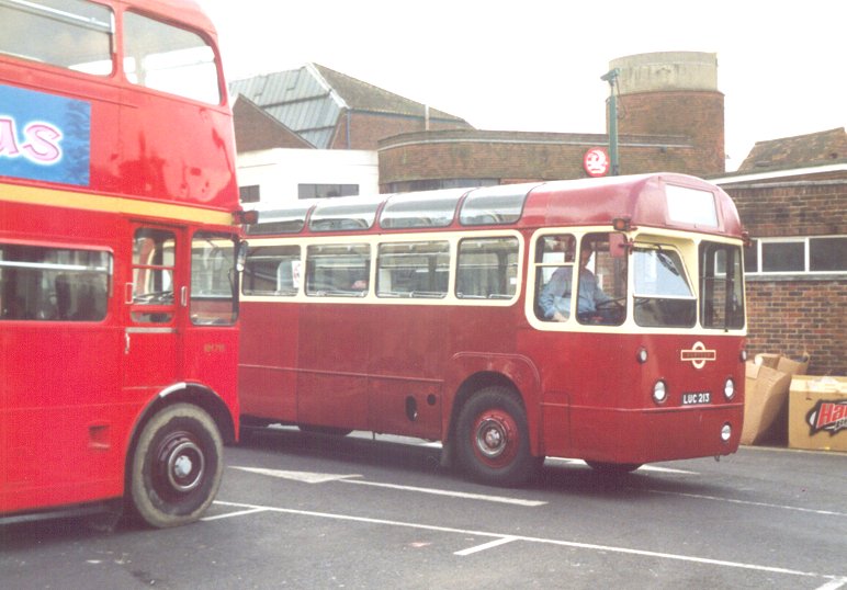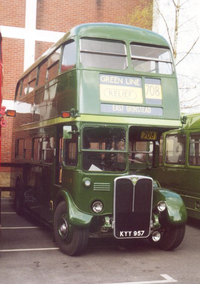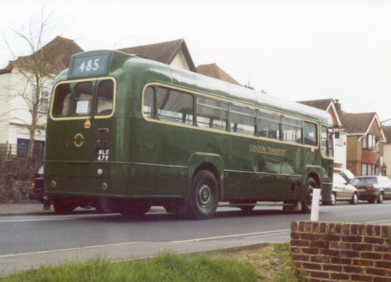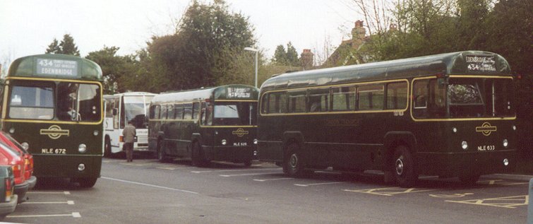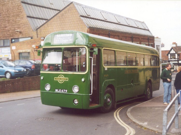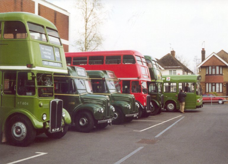 Then there was a flurry of Leyland Nationals. LS24, ex-Thames Valley Training and now resplendent in a new coat of London red, was a visitor, but apple-green SNB250 and NBC-green SNB257 were working buses, and were redirected to the "garage". Metroline London Northern's RML903, now looking rather battered and in need of some (official) panel-beating and new paint, also arrived for its duties on the 409. By now I had realised about the "garage" car-park, and set off to see what was there. Arrivals continued as I went. Now it was RFs, with RF679 representing the Country Area, arriving from Westerham on a 485 working, and RF421, representing the loans from the Central Area. Up in the "garage" I found more green RFs: RF633, RF672 and RF626, awaiting their turns on the 434 and 428. There too was T792. The restored post-war Regal sat glinting in the sunshine. Beautiful. Next was a line-up of lovely buses: RT604, in NBC green; GS32 and GS62; red RT2177 and Greenline RT3228. Another GreenLine RT, Greene-Lane's RT3491, was parked opposite.