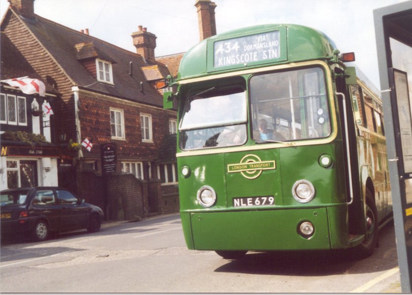 RF4 departed and the buses started to filter out onto the stand. RF 633 headed for Edenbridge on the 434 service, and RT604 headed for Dormansland on the 409. Some service buses had been unable to attend because of foot and mouth restrictions, and some surprises filled in. SNB257, repainted into London Country green from its previous Northumbria dazzle camouflage was also on the 409 (albeit with a Dunton Green blind, dating back to its days there). Red RT 2177 passed through on a 424 (Stone Quarry Estate to Copthorne), reminding us that the Country Area frequently borrowed red RTs on summer Sundays, their busiest day of the week before the widespread use of motor cars. Mike Dawes asked me if I would like to conduct (navigate) for Ray aboard RF255, which was due out shortly on a 708 tour So we set off to retrieve the blue and yellow coach from the bus park. We had to wait to turn while GS2, in sparkling Southern Motorways livery, pirouetted first. We were out on the stand on time, and were soon carrying a good load of passengers out to the north-west, out via Felbridge and round through Lingfield and Baldwins Hill back to East Grinstead, linking together the two traditional Green Line approaches to the Sussex border town. On the way back we passed green RF679, working out to Oxted Station.