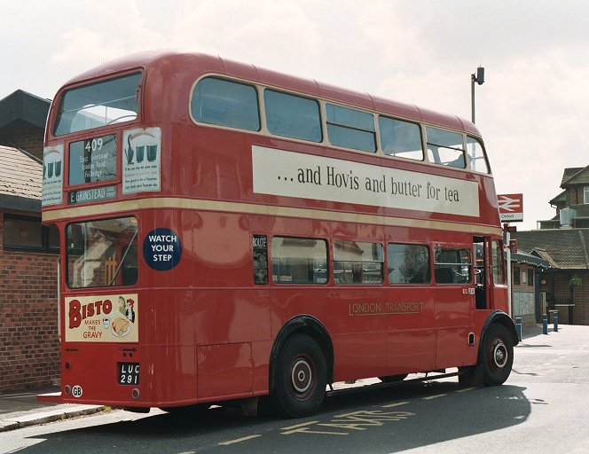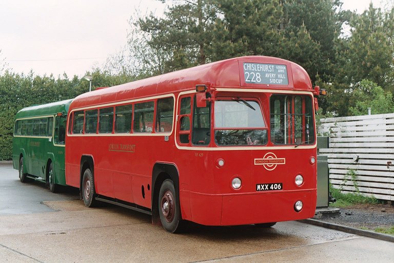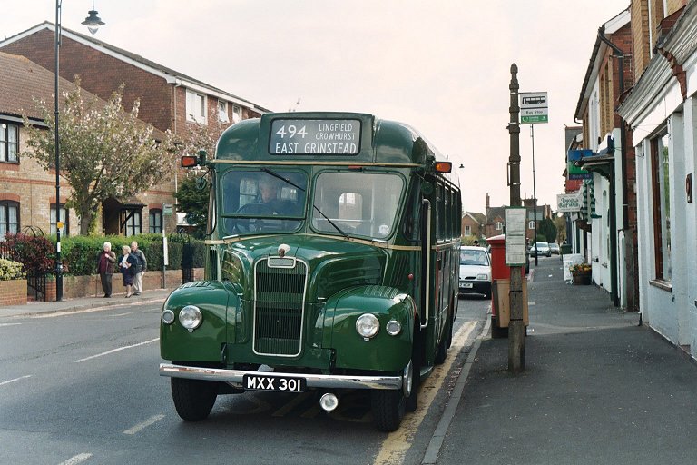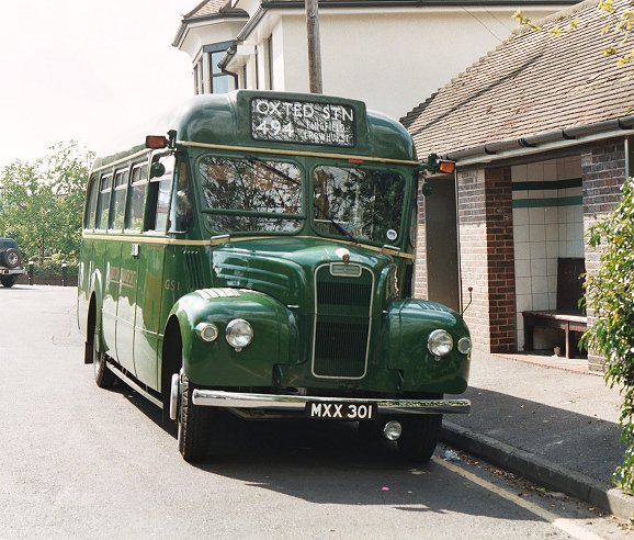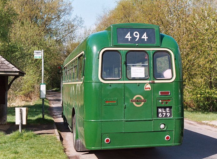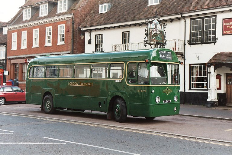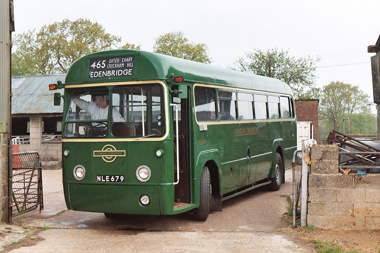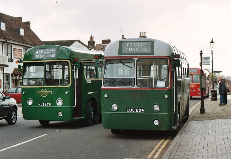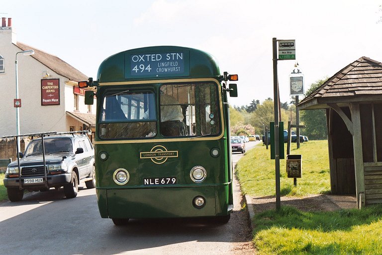 East Grinstead Running DaySunday 27th April 2003Prepared by Ian Smith, 13th May 2003Part 1: Getting there (RF679, GS1)The weather forecast was rather dubious when we met at RF679's Kent garage early (0715) on the Sunday morning. RF679 was already out of her shed and warming up, already cleaned and polished ready for the day. We set off for Ashford, for our first pickup of the morning, then rolled on along the A20 beside the Channel Tunnel Rail Link: little sign of activity this morning, but all the track and overhead wiring seemed to be in place, and the construction yard had almost been dismantled. At Lenham we met with red RF429, and made a fuel stop. Then we headed west for Maidstone and Wrotham, where we joined the A25. There seem to be an awful lot of traffic lights along this road! All red of course. The scenery subtly changed after Riverhead, as the old A25 was now even quieter and more rural past the villages of Chipstead and Brasted and along to Westerham. We had planned to meet up with RF4 in Westerham and enjoy a breakfast at the Kings Arms. It was not to be. The hotel was full, and could not accommodate our little band for breakfast. We tried the Rendezvous Cafe. It was full, at 0920 on a Sunday morning, but that might have been because the service was so slow. At 1000 I gave up and left, breakfast-less, in order to rejoin Colin Rivers on RF679, which was due to form the 1000 464 service from Westerham to Chart, and then on to Oxted. The bus was parked outside the George and Dragon, having been turned by Colin at the old turning point on the Croydon road. We left Westerham - and RF4 and RF429 - and rolled down the hill to the Crockham Hill road, where we turned south. The RF engine was heard to good effect as we climbed up onto the Greensand Ridge, through delightful scenery, to reach Crockham Hill. There we turned west onto the road to Limpsfield Chart, with superb sunlit views to the south over the Weald. We motored serenely along the ridge, amidst the trees breaking into full spring leaf, to reach Chart, where we turned off carefully between the rows of cars parked outside the church. We stopped outside the Carpenters Arms, at the bus-stop, and changed the blinds to become a 494 for the run on to Oxted Station. We could not stop for long, as we were blocking the road, so after the blind change we were off again across leafy Limpsfield Chart, back to join the A25. We by-passed Limpsfield Village, with its speed-bumps, and continued to Oxted, turning off to run down to the east side of the station. We paused to allow red RT2043 to roar past on the 1000 feeder service from Sevenoaks Station. We followed on, under the no-longer-low bridge at the north end of Oxted Station, and round to the bus-stop, pulling up behind the RT. GS1 was waiting at the stop opposite, having arrived from Holland, and was ready to form the 1045 494 service to East Grinstead. I checked that there was room, and swapped to GS1 with John Huxford. RF679 and RT2043 were due away at 1030, via 494 and Godstone respectively. Soon we were off, round the block and up the hill past Old Oxted, with the Perkins diesel roaring lustily. We turned south for the long run south through Tandridge to Crowhurst Lane End with its single-deckers-only railway bridge, where we turned left for Lingfield. All along the way the hedges and house gardens were bedecked with St George's flags, the local custom on the Sunday to celebrate St George's Day. We turned up through Lingfield, pausing at the Post Office for photos, then turned left for Felcourt and Baldwins Hill.