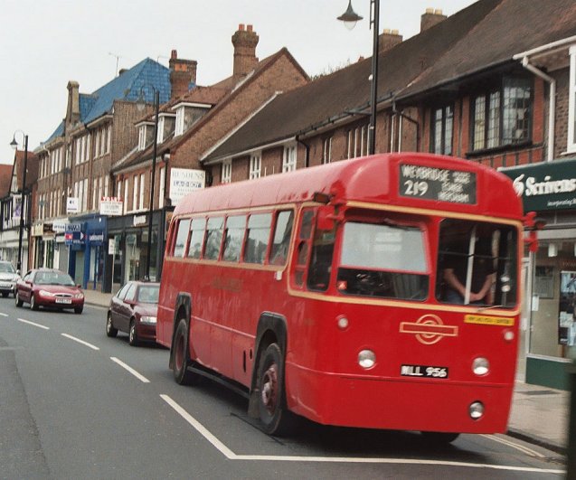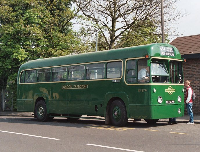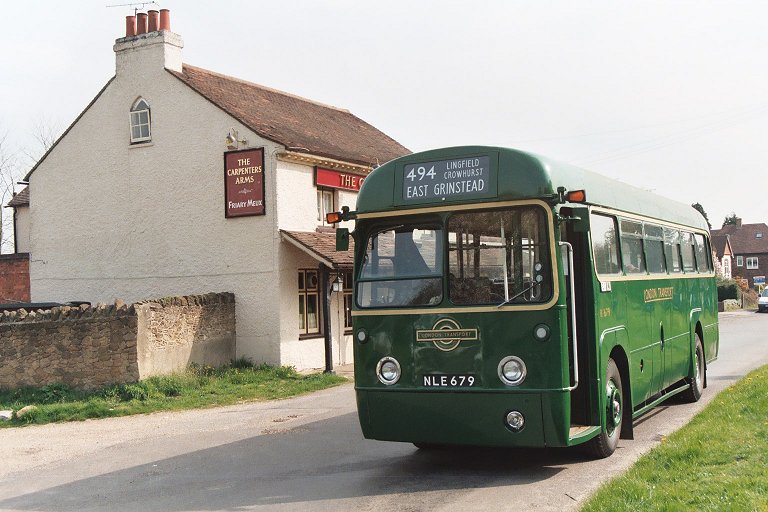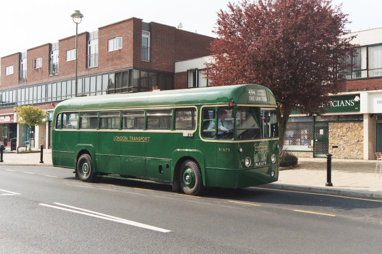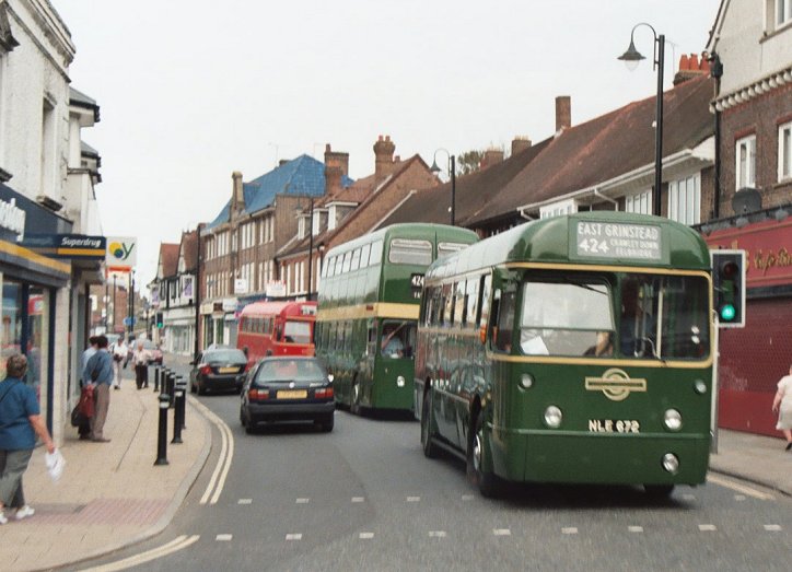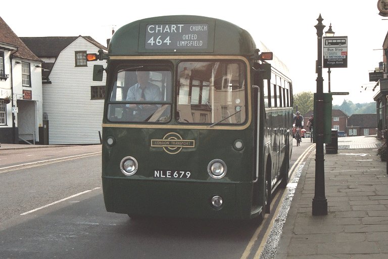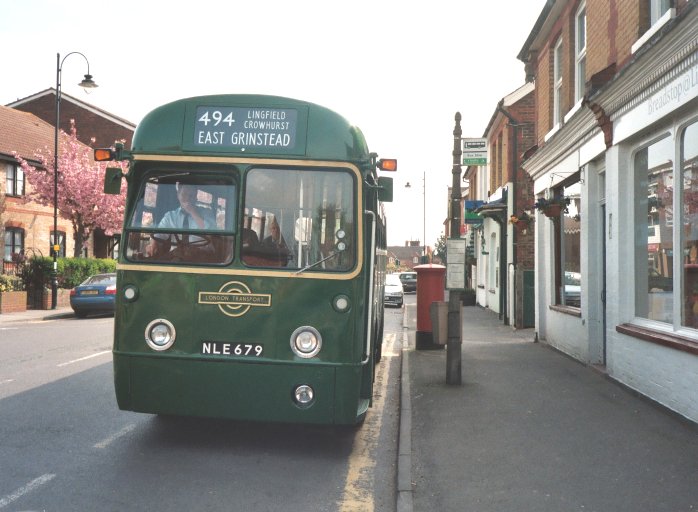 There Colin alighted, ostensibly to drive RT3148, and Steve took over RF679 for a return trip to Oxted. Problem: he couldn't remember the route. Solution: would Ian go with him? Yes, OK. So we filled up with passengers, squeezed round the block to the War Memorial and headed down the High Street. RF672, XF3 and red RF319 passed us at the King Street lights, and we turned off down to East Grinstead Station.