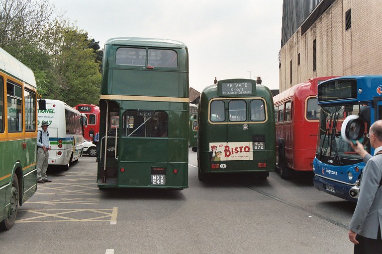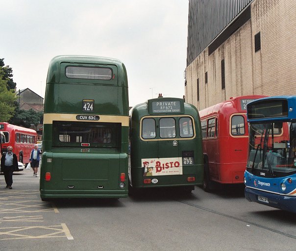It was time to get some proper lunch - and look around the King Street bus-parks before dashing off somwhere else. Sandwiches in hand (and mouth), I started to amble around. At the top of the carpark was a line-up of Routemasters: Arriva's gold-painted RM6, ex-London Country RMC1476, and RM2116, preserved in 1930s style showbus condition. A nice preview of what we can expect to see much more of in July at the Routemaster 50 celebrations in Finsbury Park.