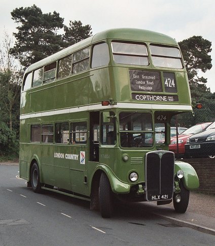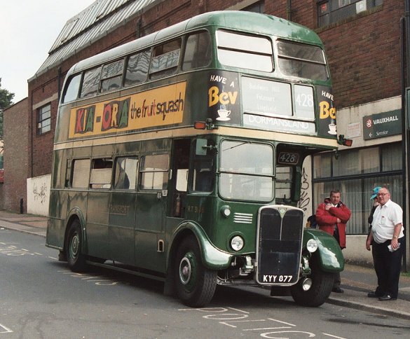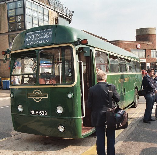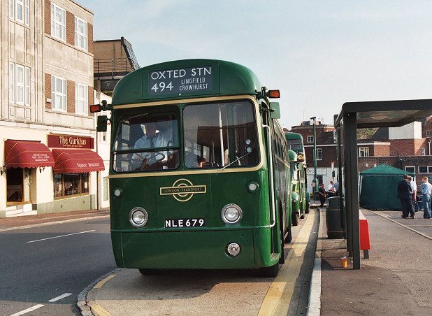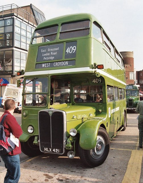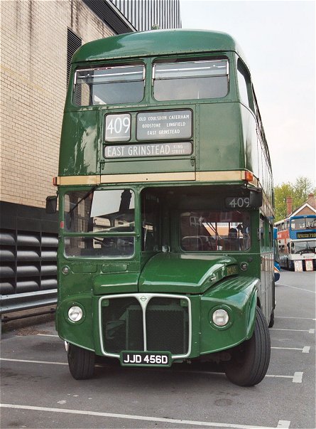 RML2456 had arrived after its spell on the 409. Alan asked me to wander up to the carpark and collect the 409 blinds from it. On the way I passed RT3148, which was not going out on the 409 to Newchapel and back because of a tyre problem. Further up the street was RT604, which had been busy on the 424 and was now resting before heading home for Croydon on the 409. I found the green RML and crew, and they gave the onlookers a minute or two to take photos before removing the borrowed blind set.