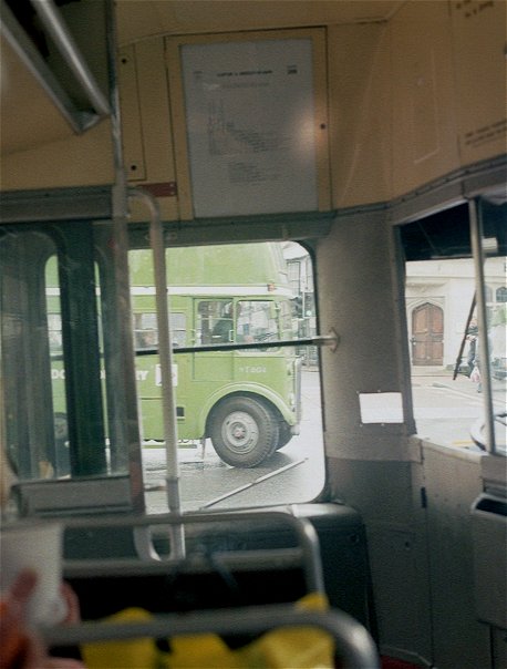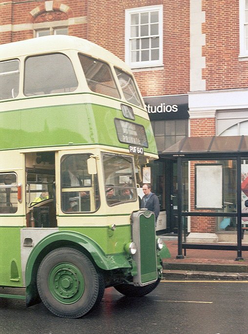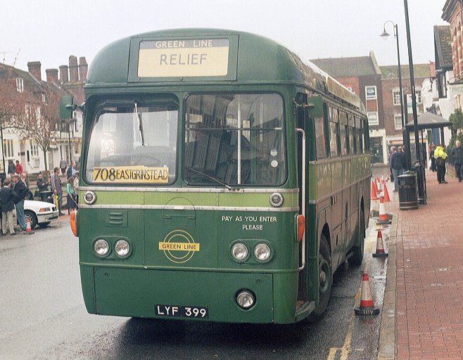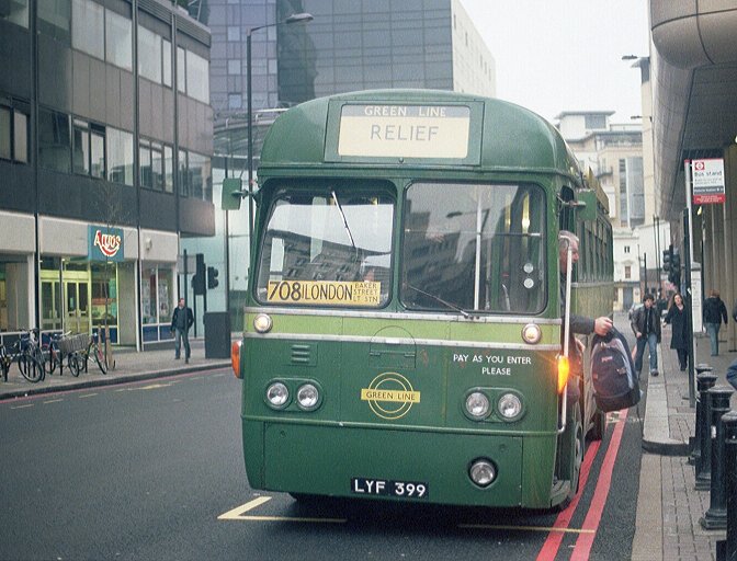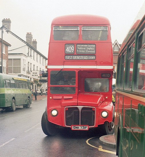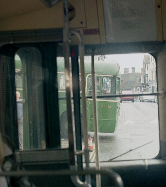 I made myself comfortable, with a view out the front. RT604 emerged ahead, coming from King Street to load for its 409 return trip to West Croydon. It was followed by RF600, also gingerly nosing out onto the main street. Then RM1033 came up the street and past us. That reminded me that I had not been to the visiting buses park off King Street. I had seen RF19 and the Alder Valley National in passing, but had not been to browse. Too late now!