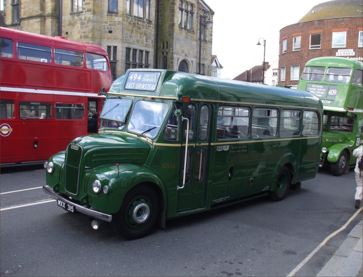 Two more of the small saloons stood opposite, by the War Memorial: GS62 and GS34. East Grinstead garage only had two of the little buses at a time, allocated to the 494, but to our continuing delight they continue to turn up in greater numbers than that at this Running Day. Today there were four (GS2 being the other one).