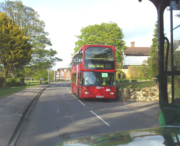 We had a quiet trip out to Edenbridge. We met RMC4 on the outskirts of East Grinstead, but had a quiet journey out past the hospital and on to Dormansland. We paused at the Plough to let some people off, then continued east over the border into Kent. We made our way up through Edenbridge, past the Star (terminus for the Oxted and Westerham services), over the River Eden and under the cross-street sign for The Crown on the main street. At the top of the village we turned left down the by-pass, then turned right to reach Crouch House Road for the quiet trawl up the west side of Edenbridge to Troy Town. We passed under the Uckfield railway line, then climbed up to Troy Town, where we passed back over the line in tunnel. We turned sharply right over the narrow railway bridge over the Tonbridge line. This time we had a good view of the adjacent railway bridge, where the Tonbridge line crosses over the top of the Uckfield line between adjacent tunnels (almost cutting into into the tunnel roof). We rolled on to the terminus at Hilders Lane, just shy of the main road north of Edenbridge. We stopped for photos, and to change the blinds for the return journey.