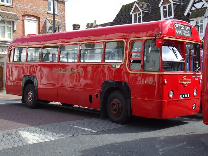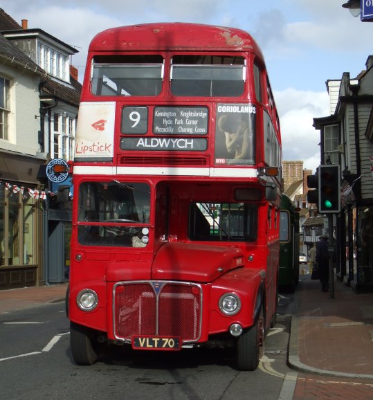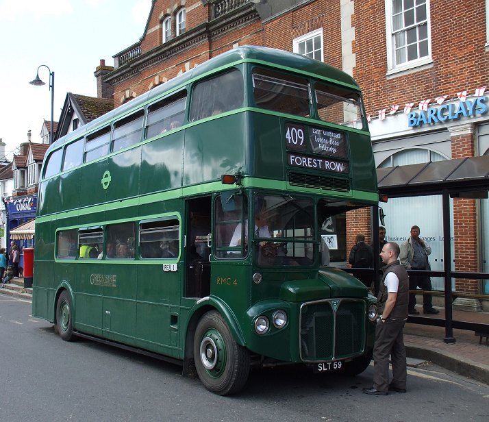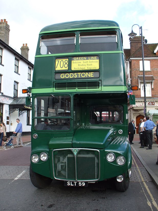 We continued on to East Grinstead, climbing up through Blackwell Hollow to reach the east end of town, then rolling along to stop in the High Street. There it was going-home time, with a long queue of parked buses about to depart. These included RMC4, on which the blinds were being changed ready for a 708 trip to Godstone, and RM70.