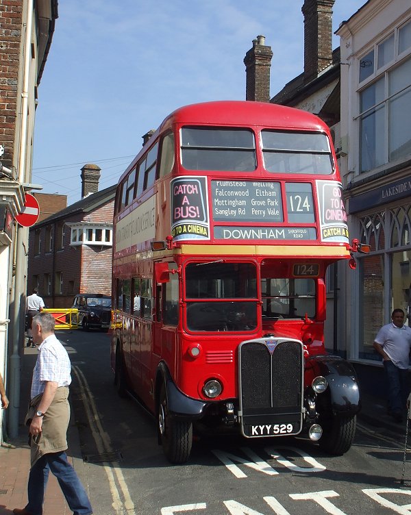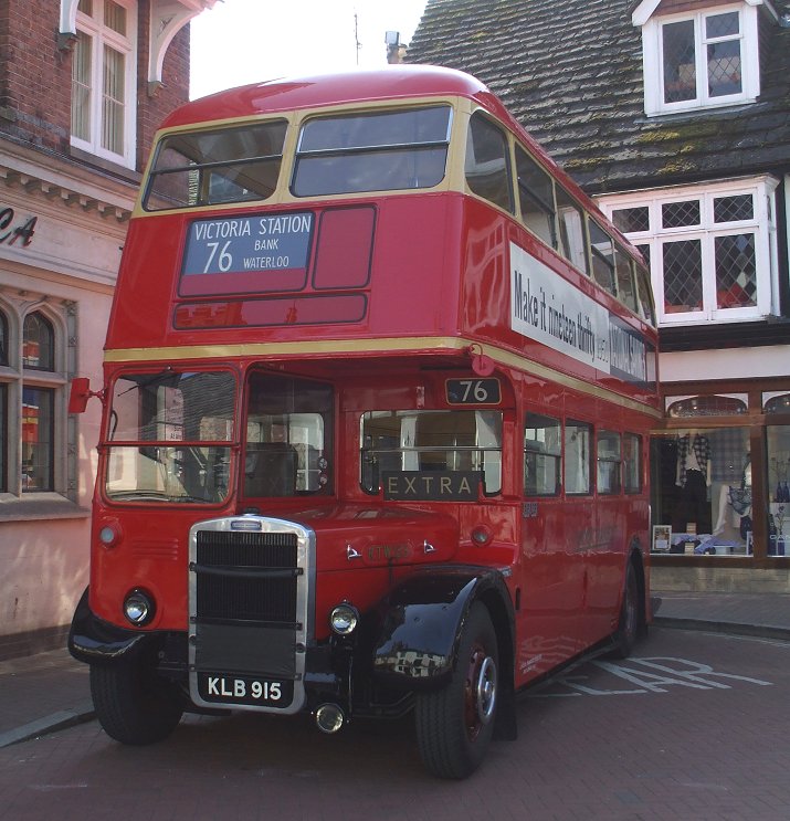 Next a pair of Central Area visitors: Catford's RT1702 occupied the same place as last year, blocking car access to the High Street from the north, and RTW185, with its trade stand, was on the south side of the High Street. RT1702 was sporting its newly applied advertisements.
