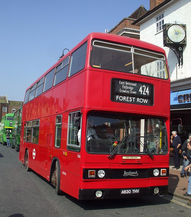 Another of the day's featured high-frequency routes was the 424, running between Forest Row and Copthorne, mainly with more modern preserved buses, which are developing their own following, and which mainly need to run outside the Emission Control Zone. One of Bromley Bus Preservatioin Group's vehicles was T1030, which headed east on the 424.