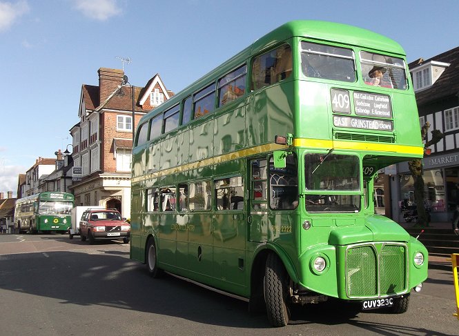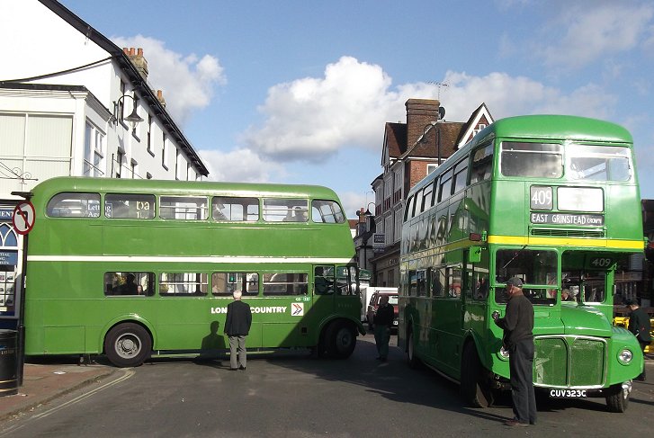 East Grinstead FarewellsBack at East Grinstead it was fairly quiet. Many buses had finished their duties and were heading home, while others waited to do the return feeder duties. DMS1868, based locally, was heading off for Three Bridges and Crawley. RF486 therefore was not needed for a return Crawley feeder, and wearing blinds for the 212 was about to head home.Metrobus Dart 374 set off on a 291 regular service to Crawley, and a few minutes later Scania OmniCity 552, that we had seen at Crawley, arrived on the 291. Two other buses, that I had only glimpsed in passing during the day, prepared to go home too: RT3183 and RF146. Similarly I had only seen RF518 and RT1798 in passing today: I hope to have the opportunity to travel on them in the future. There is a limit to what can be done in a day! RML2323 was resting after a busy day on the 409. RT 604 used Canelupe Road to execute a reverse turn, ready for the 409 feeder back to Croydon.