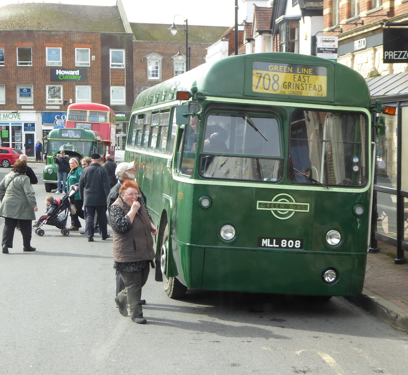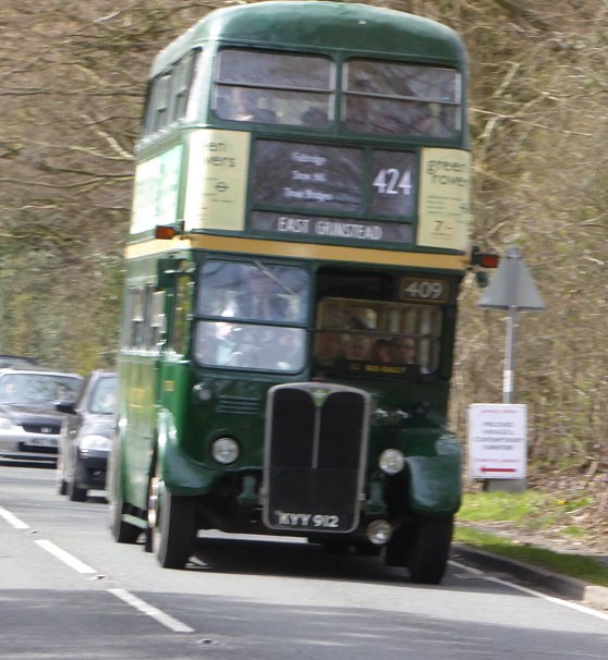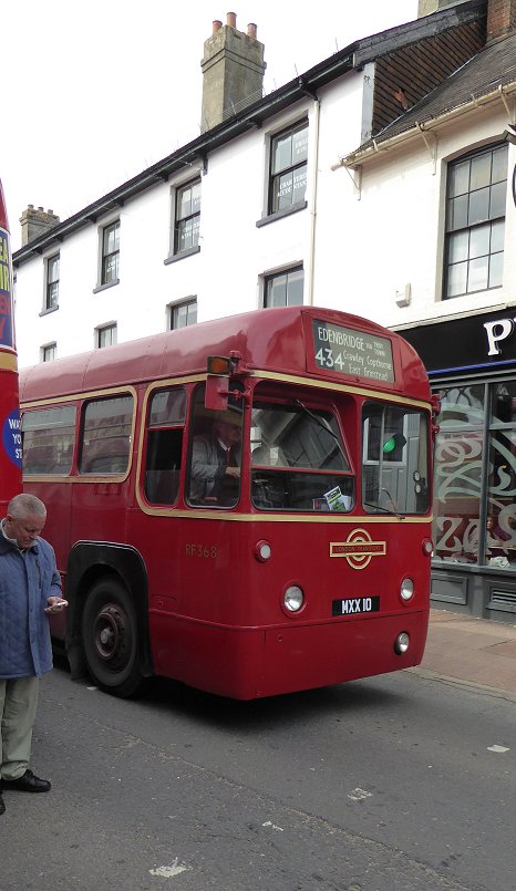 East Grinstead Running DaySunday April 10th 2016Prepared by Ian Smith, 21st April 2016.Part 5: RM2 to Copthorne and NewchapelWhen I joined RM2 the crew was busy topping up the radiator, with this bus's alligator-type bonnet open to reveal the engine. (a 7.7 litre AV470, smaller than the other Routemasters). RF368 passed by, heading east to Edenbridge on a 434. It was followed by Metrobus Dart 721 on a 409 to Forest Row.RM2 gets a radiator top-up. RF368 passes on an outbound 434 to EdenbridgeWe set off to the War Memorial to load up. We passed RF271, that had arrived on a 708 from Godstone Green, and drew up behind Dart SLF 3238, heading out on the 135 again.RF271 on 708. 3238 on 135 again.RM2 followed 3238 round the corner and down the High Street. Traffic behaviour was abysmal. SNB340, coming in on a 494, edged past 3238 and then us. Then red doubledecker DAF DLA147 squeezed past on a 409 to Forest Row. Such relatively modern buses are coming into preservation, so there should not be the large gaps in bus history that have occurred in the past.3238 squeezes past inbound SNB340 on a 494. DAF DLA147 comes in on an eastbound 409.We followed 3238 down to the station, but then the Dart turned right to reach Moat Road, while we turned left with the A22 to head out through East Grinstead suburbia towards Felbridge, passing RT3148 on the way. At Felbridge we forked left on Copthorne Road, the 424 route. We met another Country Area RT inbound: RT3183 on the 424.At Copthorne we turned right and followed the B2028 north-east to Newchapel. There we turned south-east on the 409 route back to East Grinstead. RT3183 southbound near Felbridge on the 424. RM2 heads east for Newchapel.Climbing back up through the town we met DLA147 again, heading out of town.Back up by the War Memorial we were met by 721, heading north for Godstone Green, and DL39, redressed for the 91 to Tunbridge Wells. DLA147 heads north out of East Grinstead. 721 is still in the 409, while DL39 is dressed for the 91 its route back to Tunbridge Wells.I alighted from RM2, which went off to turn and prepare to head home. Across the road stood RT4779. It was dressed for the 409 to Godstone, first stage of its journey back to Redhill.RM2 came back, heading home to the LT Museum at Acton. RT4779 dressed for the first stage of its journey home. RM2 heads home to Acton.By now most buses had departed, either on their last out and return trips, or heading for home. What was left? Was there still a RT ride to be had?...