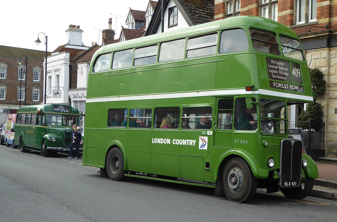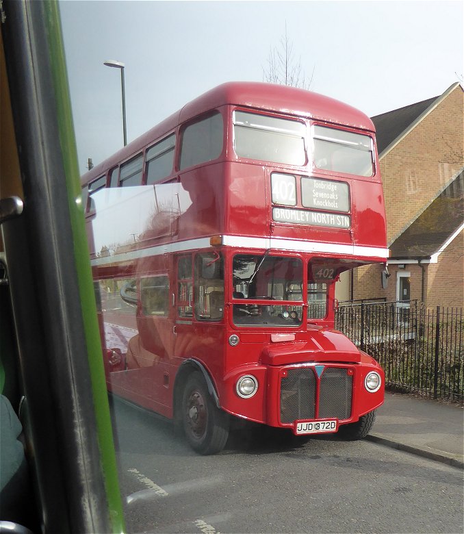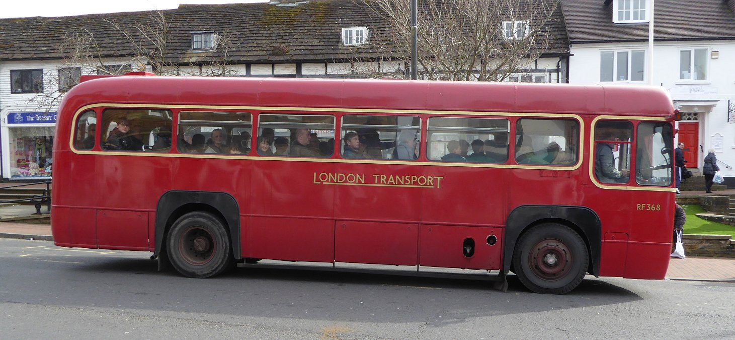 East Grinstead Running DaySunday April 10th 2016Prepared by Ian Smith, 22nd April 2016.Part 6: Remains of the dayBack at East Grinstead it was going-home time. Most out-and-back journeys had already set off. A few were coing in for the last time. Other buses were heading home. RT1798 was heading for Crawley, I think. RTW185 was heading home.RT1798 ready to go on 424. RTW185 departs between SNB340 and RT1798.RF368 pulled in from its last trip to Edenbridge fully loaded.RF368 arrives back from Edenbridge.RMC1461 was ready to head home to Brooklands, while East Kent Reliance WFN513 was going to head eastwards.Routemaster Greenline coach RMC1461. East Kent Reliance WFN513.409: East Grinstead to Forest Row and back (RT604)But all was not lost. I had wanted an RT ride to make my day, and here came RT604 on a last run to Forest Row on the 409.RT604 arrives on a late 409 to Forest Row, with GS62 parked behind.I climbed aboard, and we set off eastwards. Outside the main town we found the bus stance occupied by a pair of visiting Routemasters: RM1097, in the middle of a restoration bout, and RML2732, looking like it has just been repainted.RM1097, RML2372.We went down the long hill, by-passing Ashurstwood, to reach Forest Row. We pulled up past the Brambletye Inn, terminus for the 409 until the railway closed, and continued round the corner to the old station yard - where it terminated after the railway closed! (Law is so logical!).In the old yard we met preserved Metrobus Olympian 806, about to leave for East Grinstead. We turned in the yard and pulled up behind it. 806 pulled away, and after a few minutes it was our turn. We returned to the roundabout in Forest Row, and climbed the long bank up to East Grinstead. It was just after 5.pm. The feeder buses were leaving. RT604 was heading for West Croydon, but I crossed the road and boarded RF633. Forest Row Station: 806 and RT604.434/465: East Grinstead to Westerham (RF633)The RF was returning to Sevenoaks and beyond. My plan was to go to Sevenoaks Railway Station. We headed out of East Grinstead on the familar 434 route to Edenbridge, which in later Leyland National days was the 485. We went through Edenbridge, and climbed up past Edenbridge Station, then increasingly steeply up to Crockham Hill. There we turned right to climb tortuously up onto Hosey Common, past the entrance to Chartwell, and then down to the eastern edge of Westerham. By now my plan had changed. We should be in good time for a connection ont the 246 to Bromley.So a couple of us alighted at the carpark entrance and walked back up the steep little hill by Westerham Green. We waited at the stop there. The terminating 246 - Metrobus' EnviroDart 756 - arrived and went down the bank to turn at the carpark. It was pursued down the hill by RM1397, which had come round from East Grinstead via Godstone. RF633 pulls away from Westerham carpark. RM1397 passes through Westerham, following Metrobus Dart 756 down the bank.246: Westerham to Bromley (756)The first bus to arrive up the hill was the Go-Coach 401 from Sevenoaks and Tunbridge Wells. Dart Marshall 5003 was the vehicle. It was not long before 756 returned to pick us up. There are STILL connections at Westerham, in spite of Nicholas Ridley!Go-Coach 5003 ends its 401 journey in Westerham. Connecting Metrobus 756 starts its 246 journey to Bromley North.756 whirred northwards out of Westerham, making light of Westerham Hill. We passed on through Biggin Hill and Leaves Green, down to Keston Church. We twisted up the bank to Keston Common, and headed down past The Fox across West Wickham Common to Coney Hall. Now in suburbia, the 246 becomes a twisting back-roads route to Bromley. We climbed up through Bromley High Street and Kentish Way to reach the Town Hall, where I alighted.
