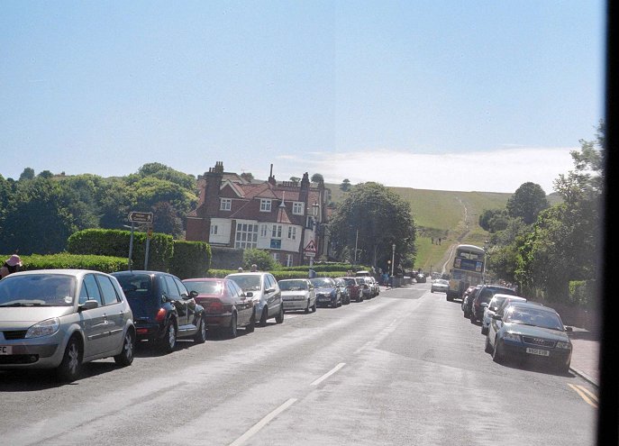 The big red bus was still at the station, about to set off for the Foot of Beachy Head. I had time to do a return trip before my next turn. So I hopped aboard, and off we went. It was only a few minutes on the direct route to the south-west extremity of town, and soon we were swinging right to round the terminal triangle, to pull up behind Eastbourne No42.