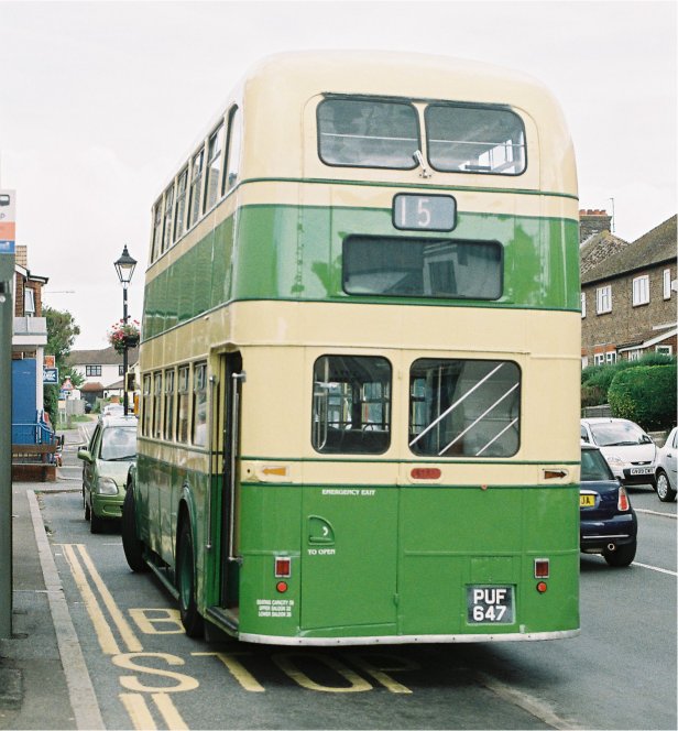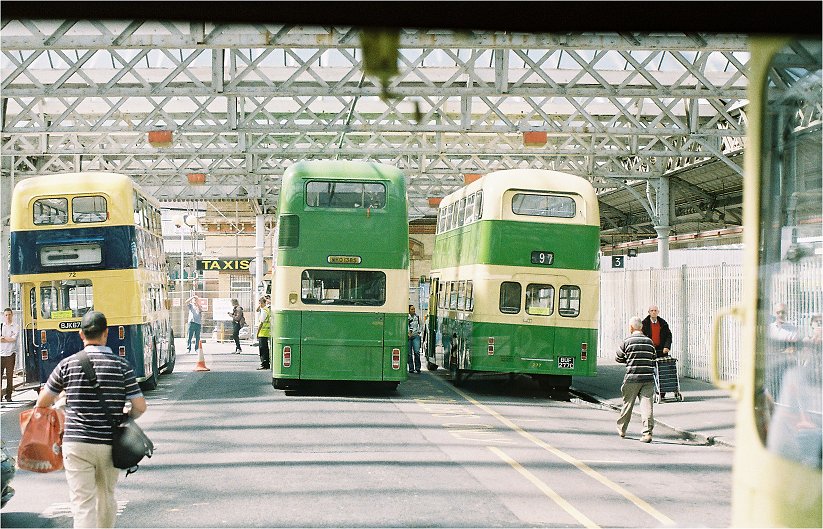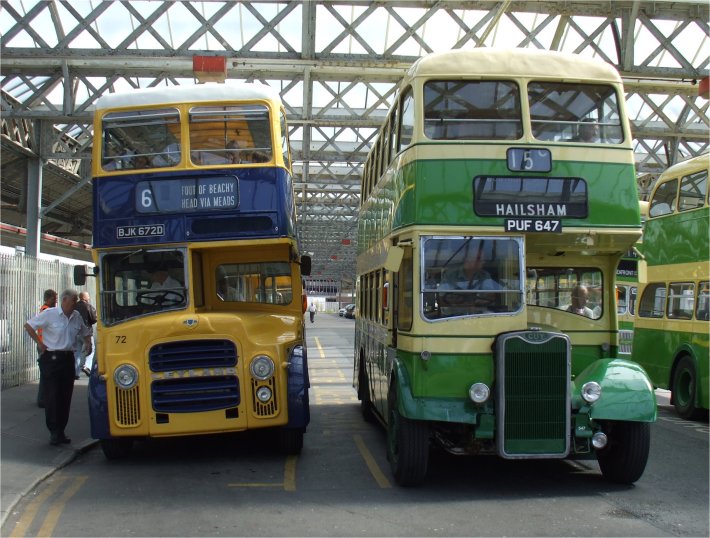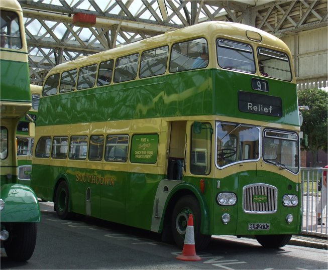 I arrived on the diesel train from Brighton to find the Carriage Road at Eastbourne Station already vibrant with activity. In the front line-up were Eastbourne 72 - a PD3 with a St.Helens front, PUF647 - a Southdown Guy Arab, and BUF277C, a Southdown Queen Mary.