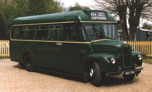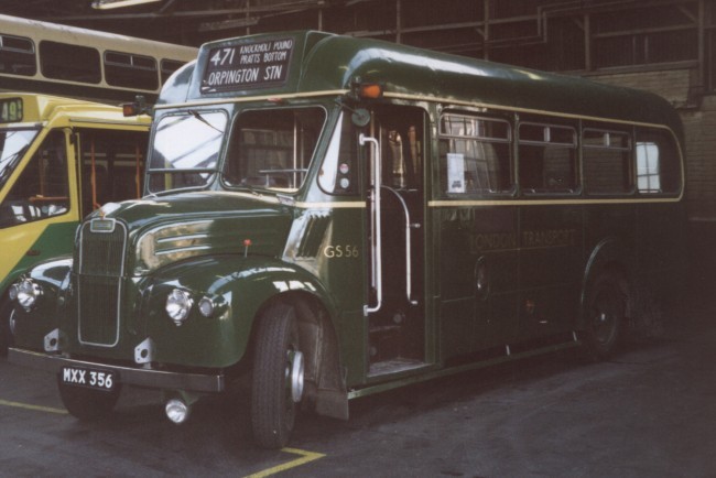 GS56 MXX 356 12/53 new to LT, Guy Special #44961, ECW B26F body #6401, LT body number 8221 12/53 MA into service: used on 348, 397 (Amersham) 8/57 MA into store, then to Aldenham overhaul 9/57 MA from overhaul, unlicensed 10/57 MA relicensed 58-61 MA 4/62 MA used on 348 10/62 SV transfer (Stevenage) 11/62 GY transfer into store, (Grays) then to Aldenham overhaul 1/63 MA from overhaul unlicensed 3/63 GR change store (Garston) 8/63 RG transfer, Aldenham/Chiswick staff bus (Reigate) 8/64 RG into store 10/64 DG transfer, used on 471 (Dunton Green) 1965 DG 12/66 DG withdrawn from passenger service 1/67 GY change store (Grays) 2/67 AM transfer (Plumstead): Aldenham staff bus 7/67 AM into store 7/67 AW change store (Abbey Wood) 8/67 NF change store (Northfleet) 12/68 CM change store (Chelsham) 9/69 sold to Bickers Coaches of Coddenham, Suffolk (school bus) 3/76 bought by TMR Preservation 2/98 visited Dunton Green for closure: see report. 4/98 active on East Grinstead Running Day part-change of ownership: preserved by Trevor Adams (Kent) 11/03 in preservation (Kent)