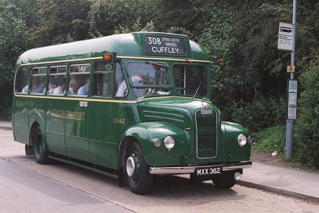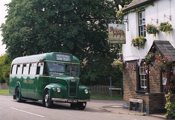 The 308 and 308A are a pair of rural routes south-west of Hertford. They climb up away from the county market town into leafy, hilly countryside dotted with villages. At Epping Green the routes divide, the 308A heading north-west to Little Berkhampstead (Little Berkhamsted), while the 308 heads south over more rolling hills to reach Cuffley, terminating at the station. From October 1967 it was extended on to reach Goffs Oak. The 308 was a large saloon route, operated by Hertford-based Leyland Tiger TF buses before crew-operated RFs took over in May 1953. One man operated RFs made them more economically viable from July 1956. But they were operated by GSs at times, notably while the RWs were working the 333 in 1962-3. GS32 at Hertford Bus Station during the September 2000 Running Day.![]() ![]() Photos taken on 1st June 2002 during the Country Bus Running Day: