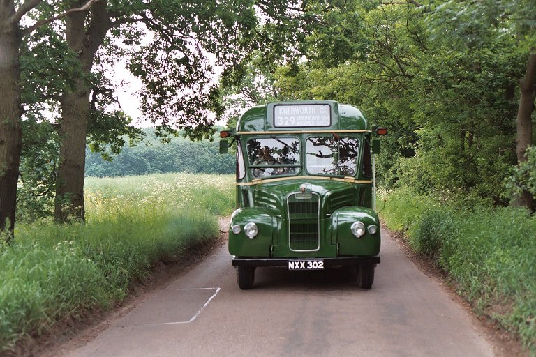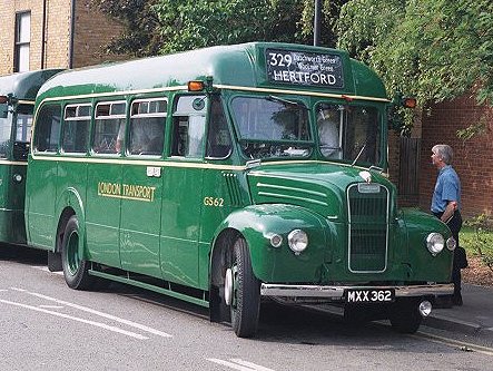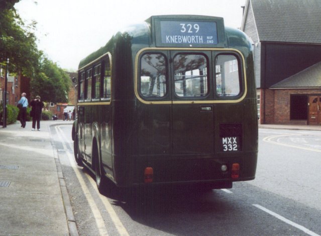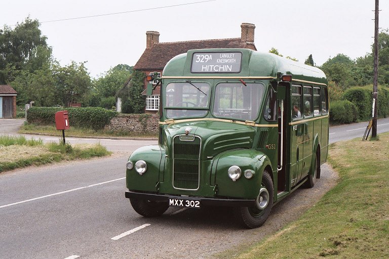 This arrangement lasted only until May 1966, when the Woolmer Green journeys disappeared, and all journeys operated via Nut Green and Datchworth, using the 329 number, on Mondays, Tuesdays, Wednesdays, Fridays and Saturdays. There was no Thursday or Sunday service. Hertford's GSs were all replaced by omo RFs by November 1968. GS2 ran through from Hertford to Hitchin during the June 2003 Running Day. Leaving Hertford as a 329 to Nup End it ran through typical Hertfordhire countryside. On the way it posed at Bulls Green wearing the short-working blinds for the 329.At Nup End it transformed from a 329 into a 329A for the run down to Hitchin. GS32 also ran through to Hitchin later the same day.AllocationHertford had a large allocation of GSs, from which were drawn those required for the 329/A (one on most days, two on Saturdays). They interworked onto the 333, 372, 386 and 388.GS2: 8/55 - 3/56 GS4: 10/53 trainer GS5: 4/56 - 1/58, 11/60 - 10/62 GS9: 5/56 - 4/59, 5/59 - 9/59, 11/60 - 10/62 GS10: 6/56 - 1/59, 5/60 - 1/65 GS12: 11/53 - c4/56 GS13: 2/65 - 11/68 GS14: 6/56 - 11/59, 3/60 - 10/64 GS15: 6/56 - 10/57, 3/60 - 2/63 GS18: 11/53 - c5/56, 7/56 - 3/60 GS19: 11/53 - c6/56, 8/56 - 3/60 GS20: 10/60 - 9/62 GS21: 11/53 - c7/56 GS22: 11/53 - c8/56 GS23: 11/53 - c8/56 GS27: 10/62 - 9/64 GS29: 6/61 - 11/63 GS33: 10/62 - 4/64 GS34: 10/62 - 5/63, 9/64 - 2/65 GS37: 11/59 - 5/60 GS44: 11/57 - 10/60, 10/64 - 8/66 GS45: 3/63 - 2/65 GS50: 12/62 - 4/63 GS52: 6/68 - 12/68 GS55: 5/67 - 12/68 GS64: 4/64 - 5/67 GS65: 1/63 - 6/68 GS72: 5/54 - 10/57 GS73: 4/54 - 12/55, 1/56 - 10/57, 7/58 - 10/62 GS74: 4/54 - 11/57, 9/58 - 12/62 GS80: 3/58 - 5/58 GS82: 5/58 - 5/58