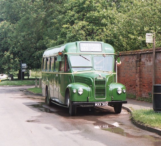 Most Hitchin services terminated in St.Mary's Square, with the abbey grounds and the grand church prominent. GS17 was there in June 2003, working the local GS routes.In April 1959 Hitchin garage closed, and its allocation of vehicles and routes mostly moved to the new garage at Stevenage. Buses worked light to and from Hitchin for the 383, with one bus running out to Weston to form the early service in to Hitchin. At times the garage journeys were worked as 303 short-workings. In October 1953 GS2 was the first GS into service, working on the 383 from Hitchin garage. In June 2003 GS2 visited the High Street wearing a Walsworth short-working blind in commemoration. Later in the day GS2 worked to Weston, and terminated at the stop which still boasts an LT bus-stop post, a shelter, and puddle.AllocationThe 383 seems to have required one bus - which did market-day shorts to Preston on the 364 too. The GS allocation at Hitchin (followed by Stevenage) seems to have been three buses: GS2 for nearly all the period from October 1953 through to October 1962, and GS8 and GS63 through to 1958. From October 1956 they were doing some at least of the 807 journeys as well. Between early 1958 and late 1961 there were a succession of buses staying for fairly short periods, giving an allocation of three or four buses to cover the various duties. After the autumn of 1961 the allocation dropped back to one. When GS2 retired it was followed by GS56 and then GS64, which stayed until April 1964.