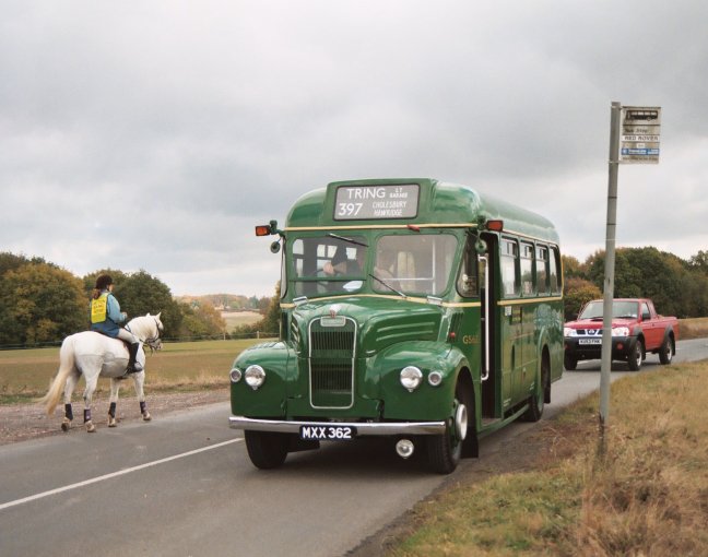 GS62 halts at the bus stop on Cholesbury Common, 26th October 2003.![]() ![]() GS2 at Tring on 26th October 2003. GS13 rounds the corner from Tring at Cholesbury Common on the same day.![]() ![]()
