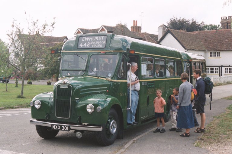 Guildford received GS buses to replace its Cubs on the rural 448 and local 448A in December 1953. The routes were worked in association with Tillingbourne Valley Services, who operated the same routes but without route numbers. On the Peaslake and Ewhurst route London Transport provided two GSs, while Tillingbourne operated one bus just as far as Peaslake. Eventually, in August 1964, both routes were taken over entirely by Tillingbourne Valley, who bought redundant GSs to operate them both. Tillingbourne amassed thirteen GSs to run their operations, including these two routes plus routes to Farley Green and Warren Road. They painted them in a blueish maroon plum colour, with white lining. The sparse operation to Ewhurst only continued until November 1965, when the half-hourly frequency service to Peaslake was also thinned out to once every three-quarters of an hour.