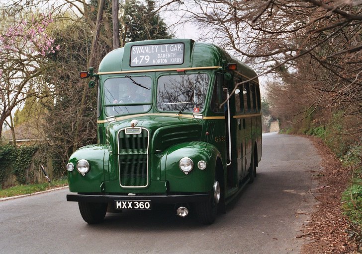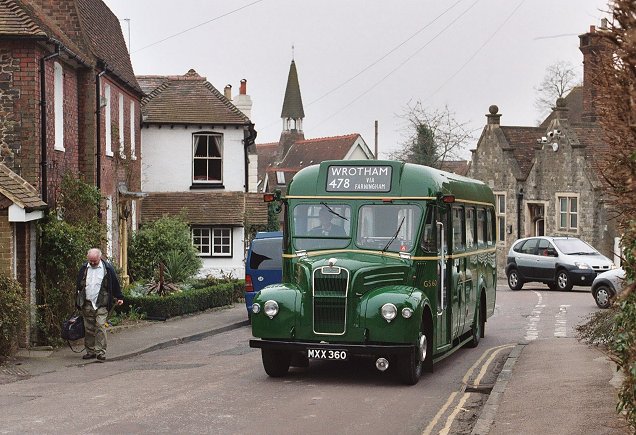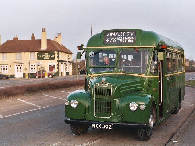 Swanley's 478 was a wartime introduction, as a replacement for Greenline route B, withdrawn on the outbreak of war in September 1939. After the war Greenline 703 came back, but the 478 remained, now operated by STLs and a Leyland Cub and providing for local journeys along the main A21 road from Swanley to Wrotham . The STLs were replaced by RTs in March 1953, and GS20 and GS26 arrived in November 1953. The two GSs were needed for the morning peak operation, after which they moved onto the 479 for the rest of the day, leaving the 478 to the RTs. After the 479 was withdrawn Swanley lost one of its two GSs, the other peak working being taken by an RT from the 423 allocation. Eventually the RT-operated 423 was extended from Swanley Junction down the A21 to Wrotham and replaced the 478 altogether. The 479 was Swanley's other Cub route, started in June 1949. It linked Farningham through Horton Kirby to Dartford, but its chief feature was its routing into Dartford along Darenth Road, which had some inviting hostelries. Evening services loaded well! It became GS operated in November 1953. But the rise of the motor car made this route an early casualty, and it was withdrawn in October 1958, one of the victims of the post-strike axe. GS62 shares the Swanley forecourt with RT1702 on the 21A and GS2, 20th March 2005.![]() ![]() GS60 noses a way through picturesque Wrotham during the Running Day on 20th March 2005. Later the same day GS2 pauses at West Kingsdown opposite the Portobello Inn on its way to Swanley Station.GS60 also ventured as far as is now possible on the 479, to The Chequers Inn on the truncated Darenth Road. On its way back a pause was made for photos near Horton Kirby, with the LCDR viaduct in the background.AllocationSwanley's GSs included the following:GS13: 9/56 - 11/57, 12/57-11/58 GS20: 11/53 - 6/56 GS26: 11/53 - 9/56 GS32: 11/57 - 12/57