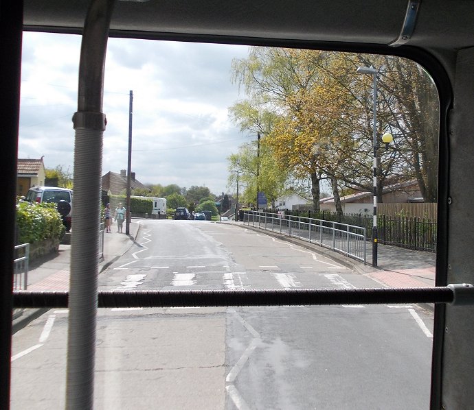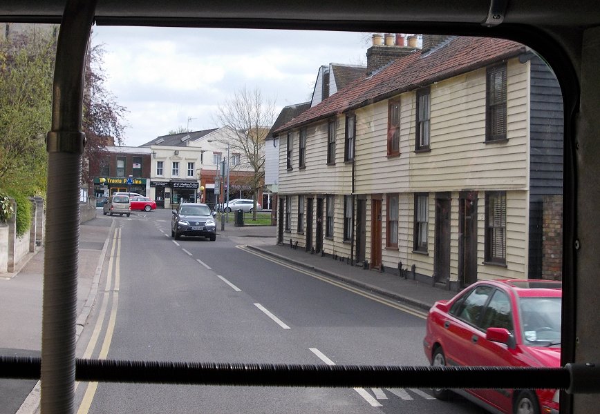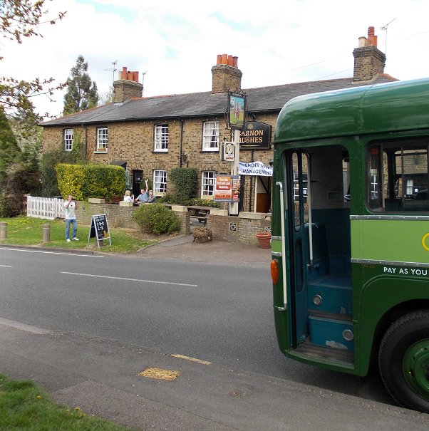 We headed south-west out of Harlow, taking the same route through Great Parndon as the 393 - apart from omitting the Katharines loop. At Tylers Cross we turned left onto Epping Road, a delightful country lane, bursting into fresh green foliage as we passed. It twisted and turned, rose and fell, joining the communities of Broadley Common, Epping Green and Epping Upland. There were extensive views over a wide swaithe of farmland as we headed along the ridge towards Epping, visible on the skyline ahead. As we entered Epping the route changed from a country back-lane route to an urban back-roads route. We turned right off the "main" road, Lindsey Street, onto Beaconfield Road, and picked our way downhill between the parked cars on this 1960s estate. Then it was left up Coronation Hill, and left again to climb St.John's Road up into central Epping. We arrived in Epping High Street beside St John the Baptist Church, and crossed almost straight over into Station Road. We were summoned to stop at the bus stop just down the hill. We rumbled on down the hill, not turning in to the station, to the surprise of some of passengers, who then scrambled to alight. We went on down into the valley bottom, and followed Stewards Green road alongside the stream towards the M11, as far as The Merry Fiddlers. There we turned left up Coopersale Street. A band of elderly mods on Vespa scotters came pouring down the hill. The Theydon Oak pub seemed to be doing a roaring trade, judging by the number of cars clogging the roads all round it. We turned right up Houblons Hill to the village of Coopersale Common, where we drew up opposite the Garnon Bushes public house. We had a few minutes before our return journey, so we walked over to The Garnon Bushes and chatted with the people outside, who were interested in the bus and what we were doing with it. A toot of a railway horn and the thumping sound of a Sulzer diesel engine gave brief warning of an approaching train. Southern Region 3-CIG No 7423 nosed across the railway bridge just north of the pub, propelled by Derby Sulzer Type 2 D7523. It disappeared up into Epping Forest, towards its terminus just short of Epping Station. A little while later the Epping-Ongar Railway train came back, well-camouflaged amid the spring foliage.