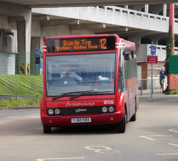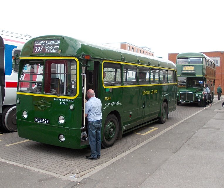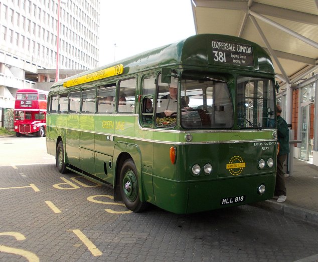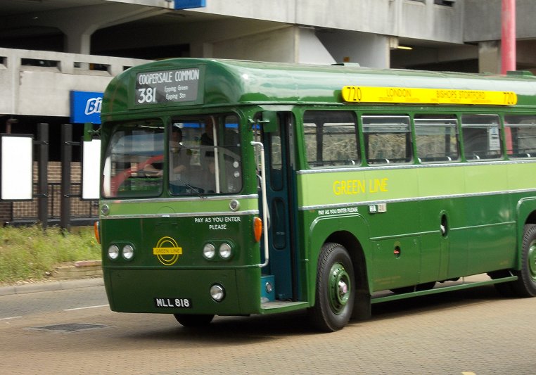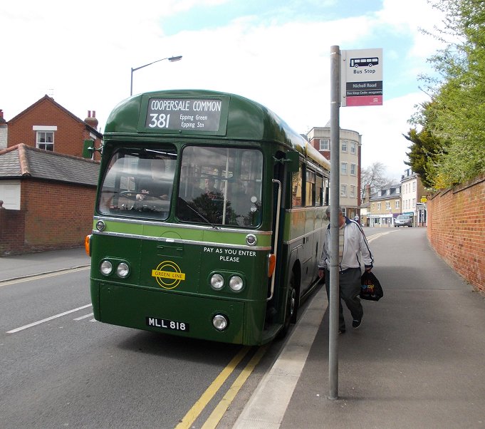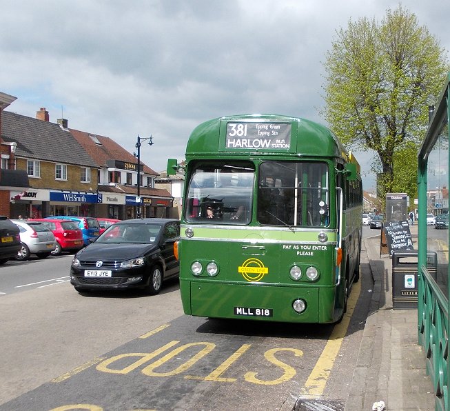 Harlow Running DaySunday May 5th 2013Prepared by Ian Smith, 14th May 2013.381 Harlow Bus Station to Coopersale Common: RF281After I alighted from BN45 I walked down the bus station past RMC1507 and RF308.Down on the stands RF600 was loading for a trip on the 390 to Sawbridgeworth. Red RF354 pulled in alongside it to load for the 393. Another of Regal Busways' Solos, 203, purred through the Bus Station on a local Sunday service. I headed for the shopping centre, and found M&S. They provided me with a sandwich and a drink. I returned to the bus station in time to glimpse GS13 arriving back from Hertford with a 390. Its modern equivalent, small Solo 206, came bustling under the bridge to load for local route 12. Modernised Green Line RF281, wearing side-boards for the 720, came round onto the stand for the 381 to Coopersale Common. Green Line RFs and crews sometimes worked a local turn at the start or end of a shift. The crew welcomed me aboard, and I enjoyed the luxury of a forward-facing seat at the front - Green Line RFs had these instead of the long bench seats or luggage pens of their bus brethren.