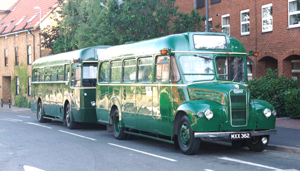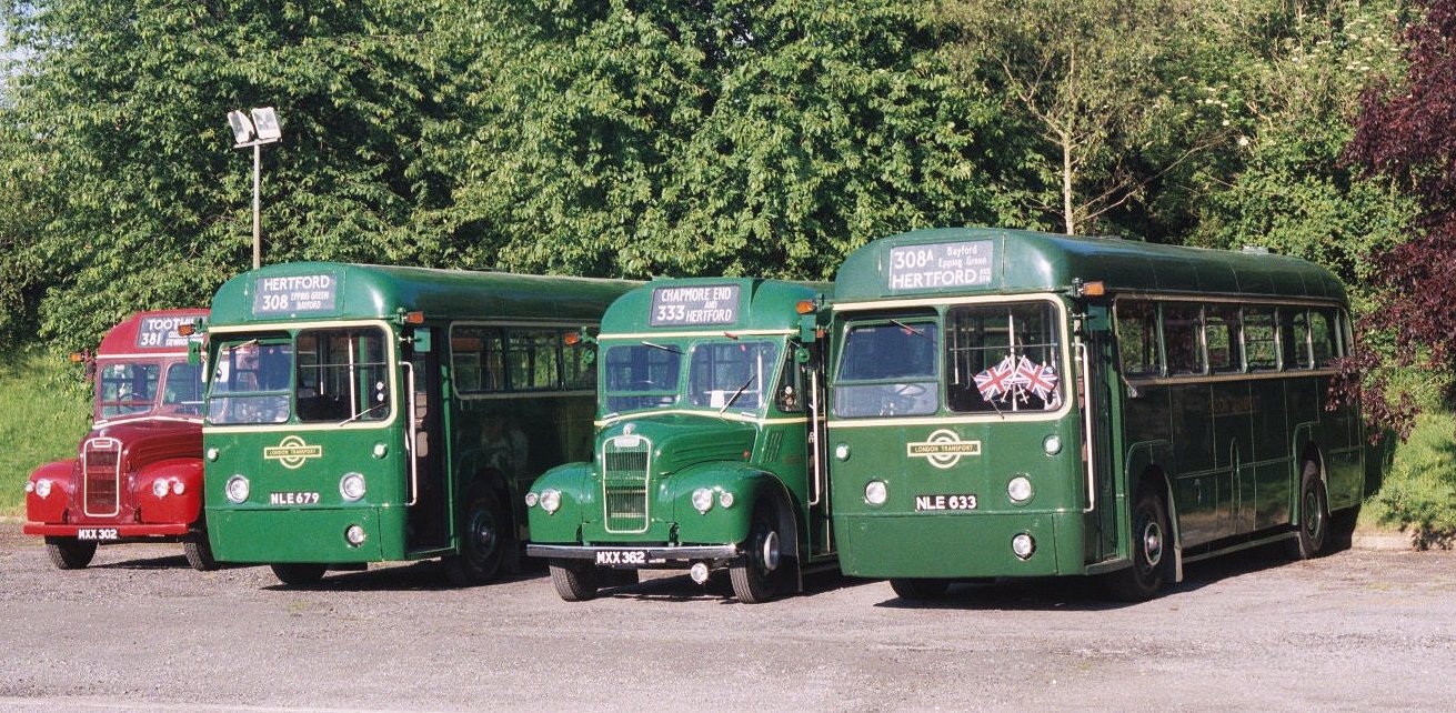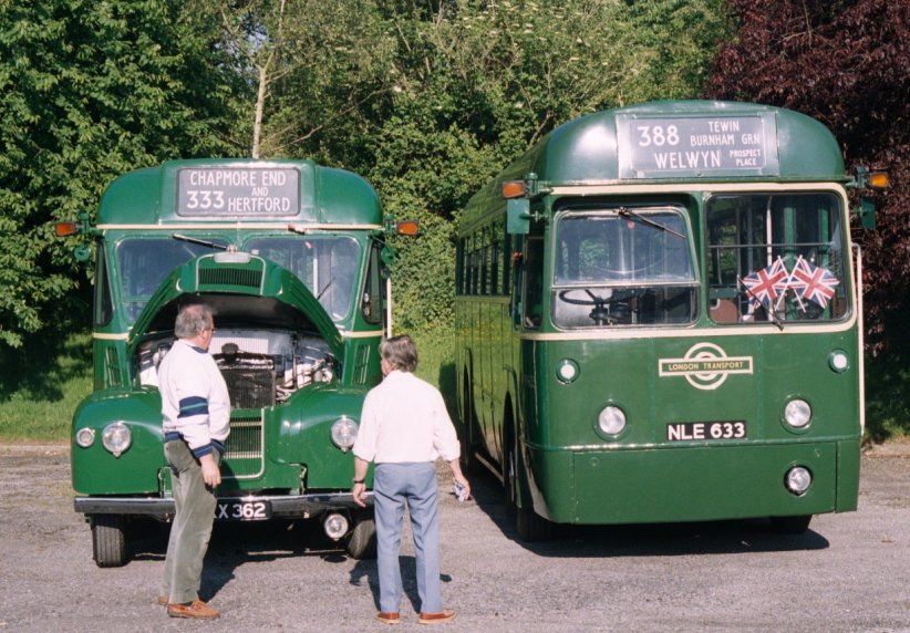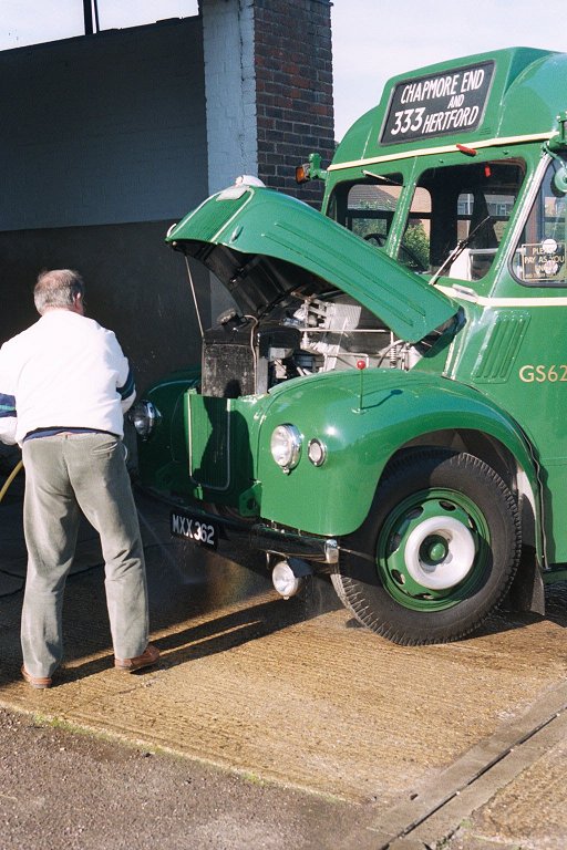 Hertford & Stevenage Running DaySunday June 2nd 2002Prepared by Ian Smith, 17th June 2002Part 2: Before Breakfast at HertfordBefore we could have breakfast in the morning the buses needed checking and bringing into Hertford. They drivers had left before me, and I sauntered along towards Fairfax Road in the delightful early morning sunshine. An early GreenLine 724 slid past, heading for Heathrow Airport. It was one of Arriva's DAF/Plaxtons, 3448.I found the buses and crews. There were GS2, RF6769, GS62 and RF633. There was blue smoke as cold engines coughed into activity. RF side panels opened for a top-up of engine oil. GS bonnets opened too. GS62 had suffered a touch of clutch slip on the run-in the day before, and the fault was traced to diesel contamination from a weeping injector coupling. That was rectified, and the GS taken for a wash. Then it was off to a deserted Hertford Bus Station, where the buses were parked while we went for breakfast.