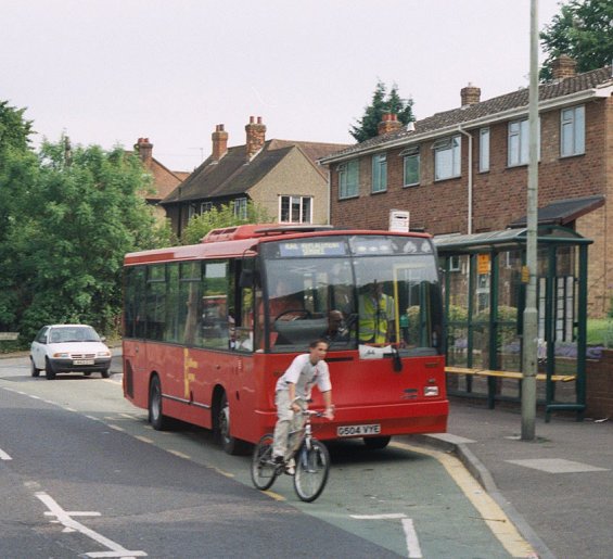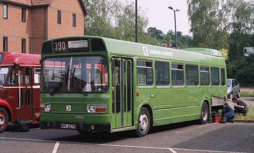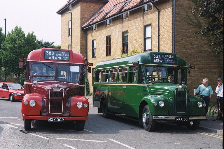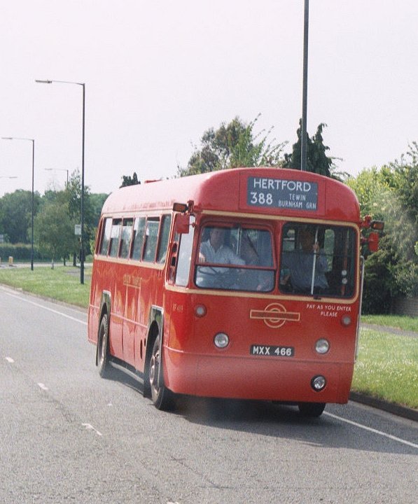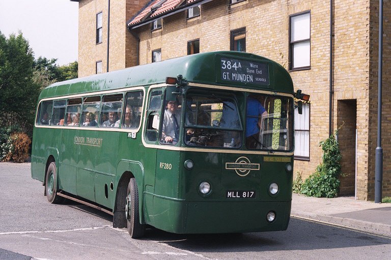 Hertford & Stevenage Running DaySunday June 2nd 2002Prepared by Ian Smith, 17th June 2002Part 6: 388: Hertford - Welwyn (GS2)As I was leaving the bus station, so was John Hinson in RF208, heading for Great Munden on the 384A. SNB312 came in round the corner with another 390 from Stevenage.Round in the bus-park I found RT604 resting between turns, and RT3148 revving up for another stint on the 341.. SNB312 very quickly arrived, to lend aid and succour to RF257, which was suffering injector problems. GS2 was waiting down the end, set up for a 388 trip all the way to Welwyn Church, and I joined for the ride back to the bus station. There we loaded up - another full load, and I alighted while Peter turned GS2 past GS1. He paused to pick me up and we were off. We wiggled through Hertford, passing Dart 3481 on the 395, and out to the west. Before the road narrowed down we passed RF489 coming the other way. Peter explained how the route had always been timetabled so that buses would not meet on the narrow bits, despite the frequency of the service. We were quickly into the back lanes straggling over the countryside towards Tewin. Trees arched overhead, forming a deep green tunnel. We emerged into pretty Tewin, and stopped at the bus shelter. A group of local lads asked to see on the bus. After more narrow lanes, and sharp twists and turns we reached Welwyn North Station. The GS managed fine, but how Leyland Nationals got down those lanes I don't know! Down the hill and along under Digswell Viaduct and we were into Welwyn. Prospect Place was no longer viable, so we terminated at Welwyn Church. Then we wiggled our way up to a roundabout, in order to thread our tortuous route back through Welwyn and back to the east. We howled up the narrow lane to Welwyn North Station, and dropped off several passengers. Then it was back along the twists to Tewin, back through the green tunnel and down into Hertford. At Hertford North Station we paused to let off another passenger, and passed DT4 on Rail Replacement duties. We pulled into Hertford Bus Station, and I was relieved to see RF4 still there.