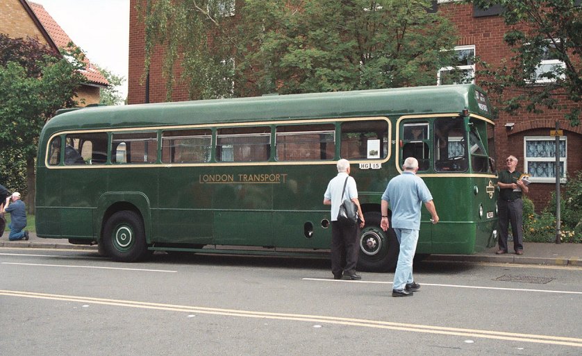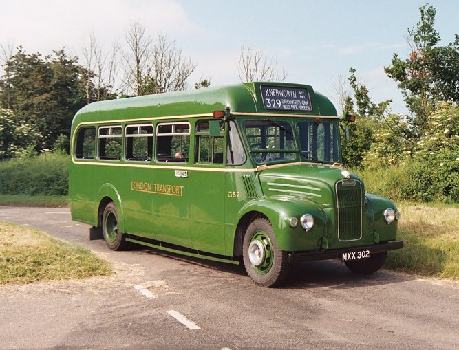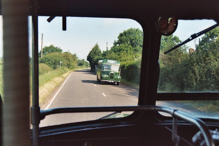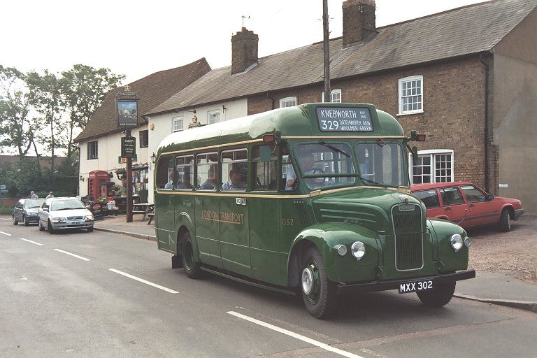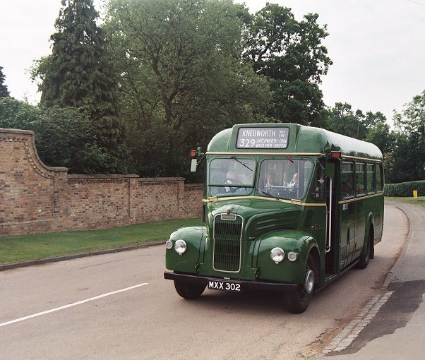 We went on across the green, and along the country lanes to Woolmer Green, where we turned right onto the old Great North Road for the run in to Knebworth. There we turned up the steep climb up under the main line railway, with its double-decker prohibiting low bridge, passed the station and ground up the hill to Old Knebworth. We turned left past the way to Knebworth House and passed through the village. There was a gymkhana or horse-show in a field on the right, and a small traffic jam of horse-boxes waiting to get in. We threaded our way past, and ran on to the end of the village at Nup End. There we turned on the complicated triangular four-exit crossroads, and parked for a few minutes, oddly out of the way on the central section of road. This was the 329 terminus, so Peter changed the blinds for the 329A to Hitchin, as was done in the old days.
