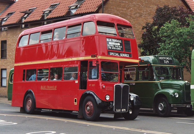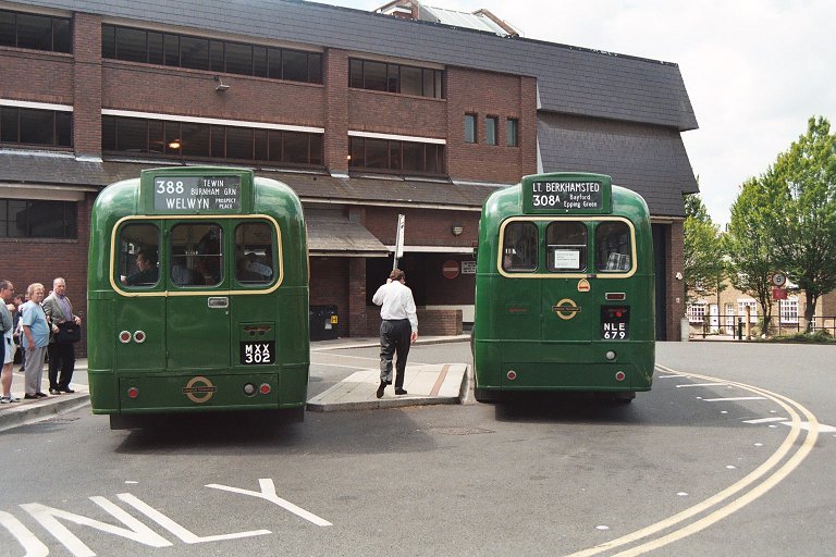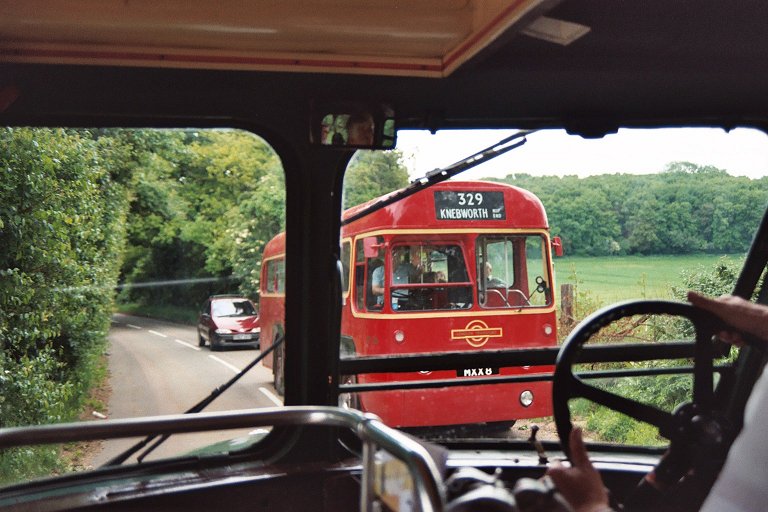 While I had lunch outside the cafe, the shape of my day changed suddenly. It had been formed around doing a conducting turn on the 341 later in the afternoon, with an earlier trip aboard T792. But now Colin, the event organiser, needed a navigator for the 329/A, as John Huxford, with GS1, had previously only gone as far as Knebworth Station. As I had done the trip earlier, I was the obvious candidate. So I finished my lunch, and watched events in the bus station: red RF406 departed on a 384A to Great Munden, and RT3871 looped through, doing one of the Fun Day tours I think.
