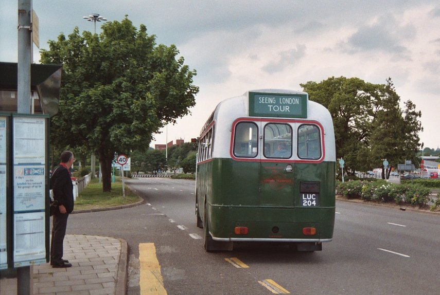 The Eastbourne Regent V came in off another tour working, and RF4 came in for its lonely 384 working north to the very tip of the old London Transport Country Area at Letchworth. 1715 came, and we set off, with quite a decent load, some for Ware, some for Stevenage, some extracting the very utmost from the journey. We headed east along the road to Ware, only to be stopped for a train at the level rossing at Ware Station. It gave me an opportunity to slip off to take a picture.