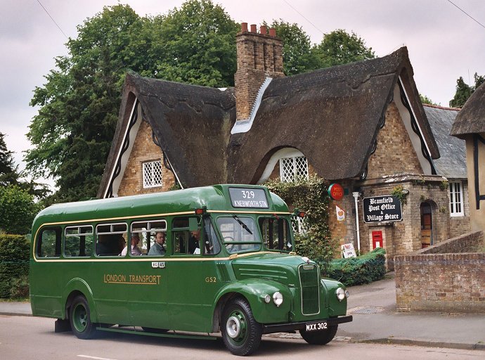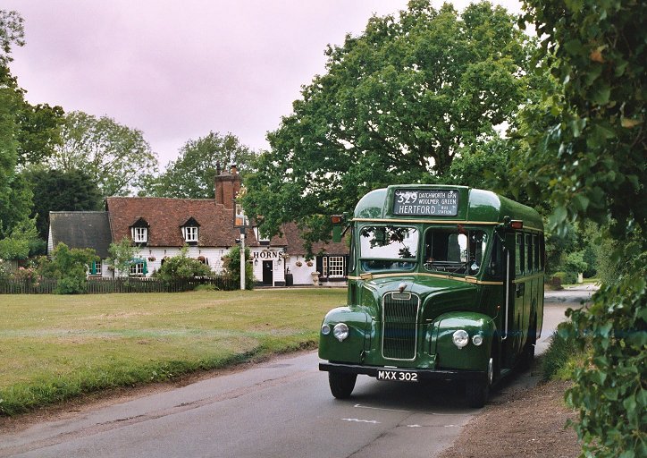 We set off on time, back along the 329 route. We wiggled through Woolmer Green and Datchworth Green, and stopped at Bulls Green for photos. Roadside photographers told us that GS17 had been through a few minutes ahead of us. Peter put the Bulls Green short-working blinds up for a minute or two, before redressing the bus with the correct Hertford destination blind. We went on to Bramfield, and stopped opposite the Post Office next to the telephone box.