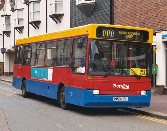 Just after seven in the morning Peter Aves and I went to fetch GS2, parking the bus in Hertford Bus Station before returning to our hotel for breakfast. The only other bus around at that time in the morning was one of Trustline's 9.8m Dart/Plaxtons, (M150 HPL, ex-Metrobus/East Surrey), waiting round the corner from the bus station before going on rail replacement duty.