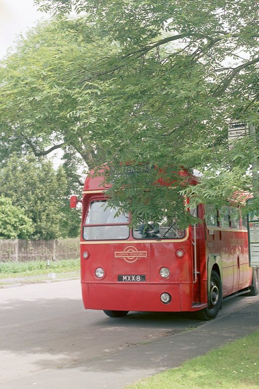 We set off from the bus station, and met RML2364 as we rounded the big roundabout to head west. We headed out of Hertford on the Hatfield Road, but soon pulled off the modern dual carriageaway to take the older, more circuitous road through Hertingfordbury. We dipped to cross the River Mimram, then wound our way up through the village. We passed through Staines Green, then pulled up at the stop in Birch Green to take pictures of RF366 in the ash tree!