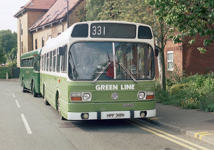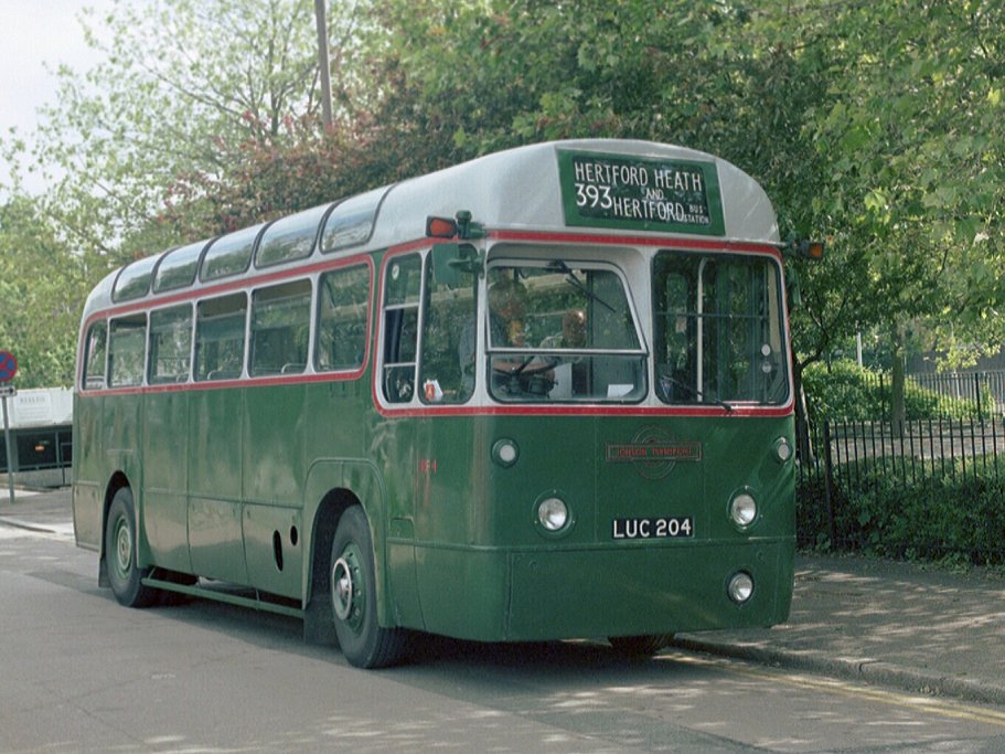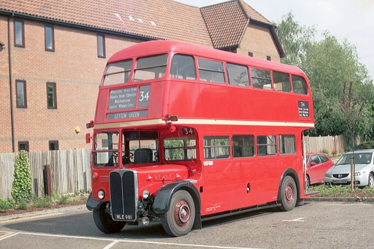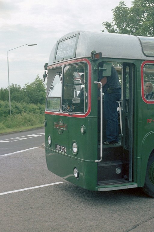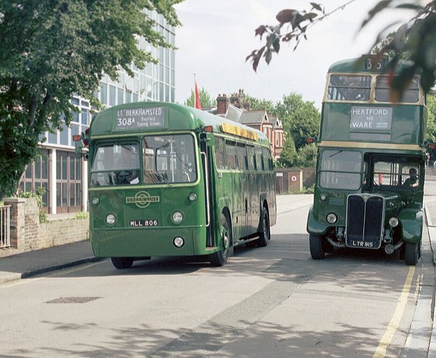 I walked back to the road to look at the RFs. RF281 was resting after a stint on the 715. Earlier in the day it had worked in from Bishops Stortford via Standon, and would return that way in a little while. Sister Greenline RF, unmodernised RF269, came in after a trip on the 308A, passing RT3496. The RT was resting after a speed-hump in Ware had torn the back of its platform while it was out on the 395.