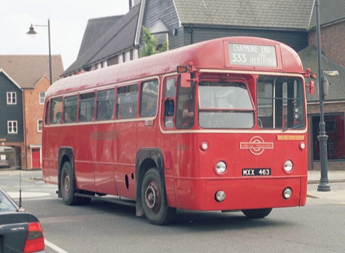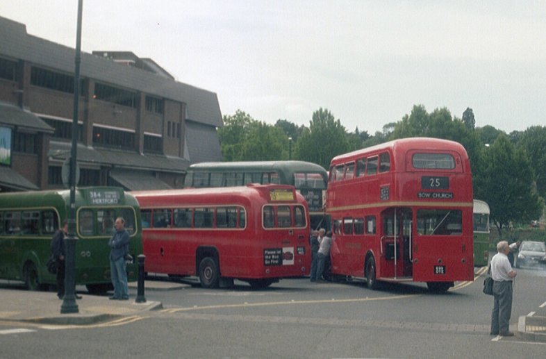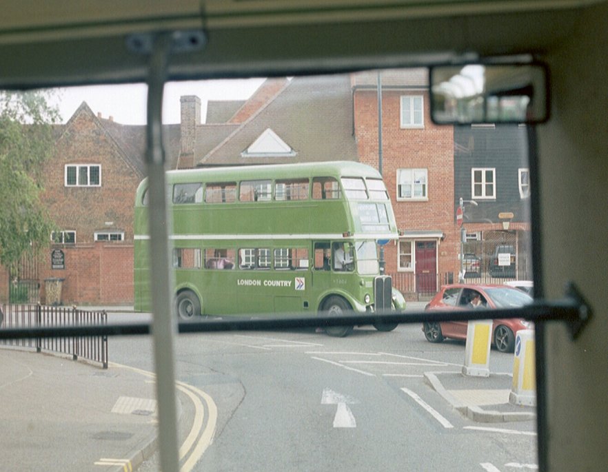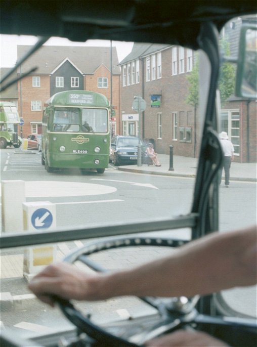 Then it was back down the hill to Hertford. It was about five o'clock, and the bus station was choked up with the final arrivals and with the buses loading for home-going long-distance feeder services. Thus on our way in to Bircherley Green we met RF366 arriving back from the 308A and then preparing to head for Potters Bar on the 350A, and RT3254 coming back in from the 390.