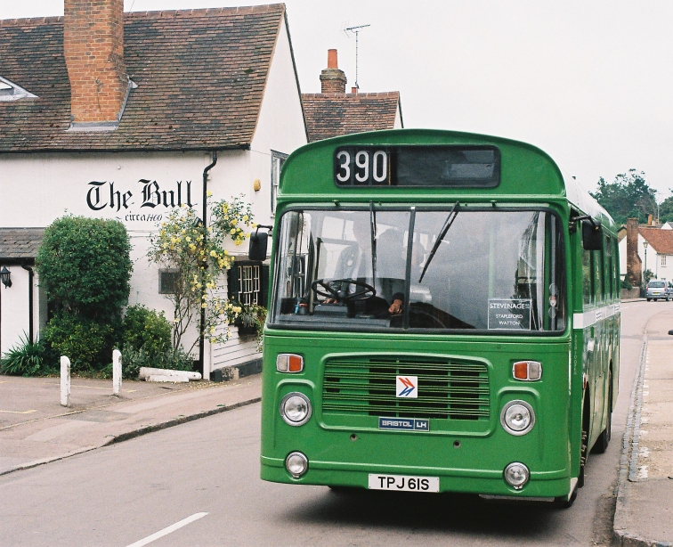We roared northwards. (I think "roar" is an appropriate verb for Bristol LHs!). We turned in to Watton and paused at the Bull for photos. Then we motored on northwards into Stevenage, sticking to the main road to avoid the speed bumps of the old route. We negotiated the southern roundabouts and wriggled into the bus station, pulling up behind Roger Wright's open-top RT3435, which appeared well-loaded. It promptly disappeared on a 303 service to Hitchin.
